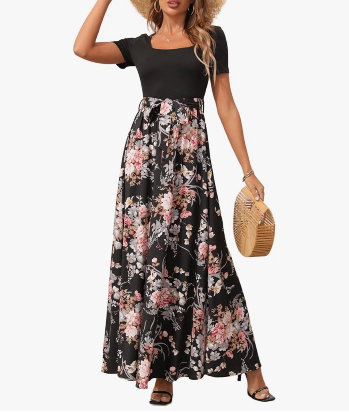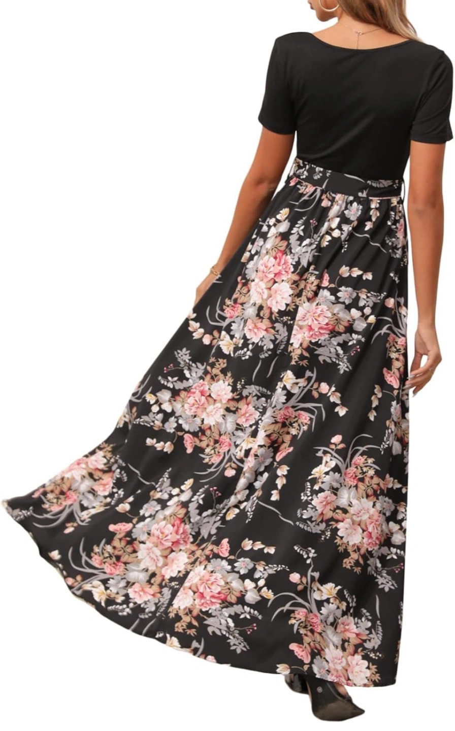 Beautiful floral maxi dress. Black bodice, floral maxi skirt. Short sleeves. Fitted waist with tie. Perfect for springtime events. New in packaging