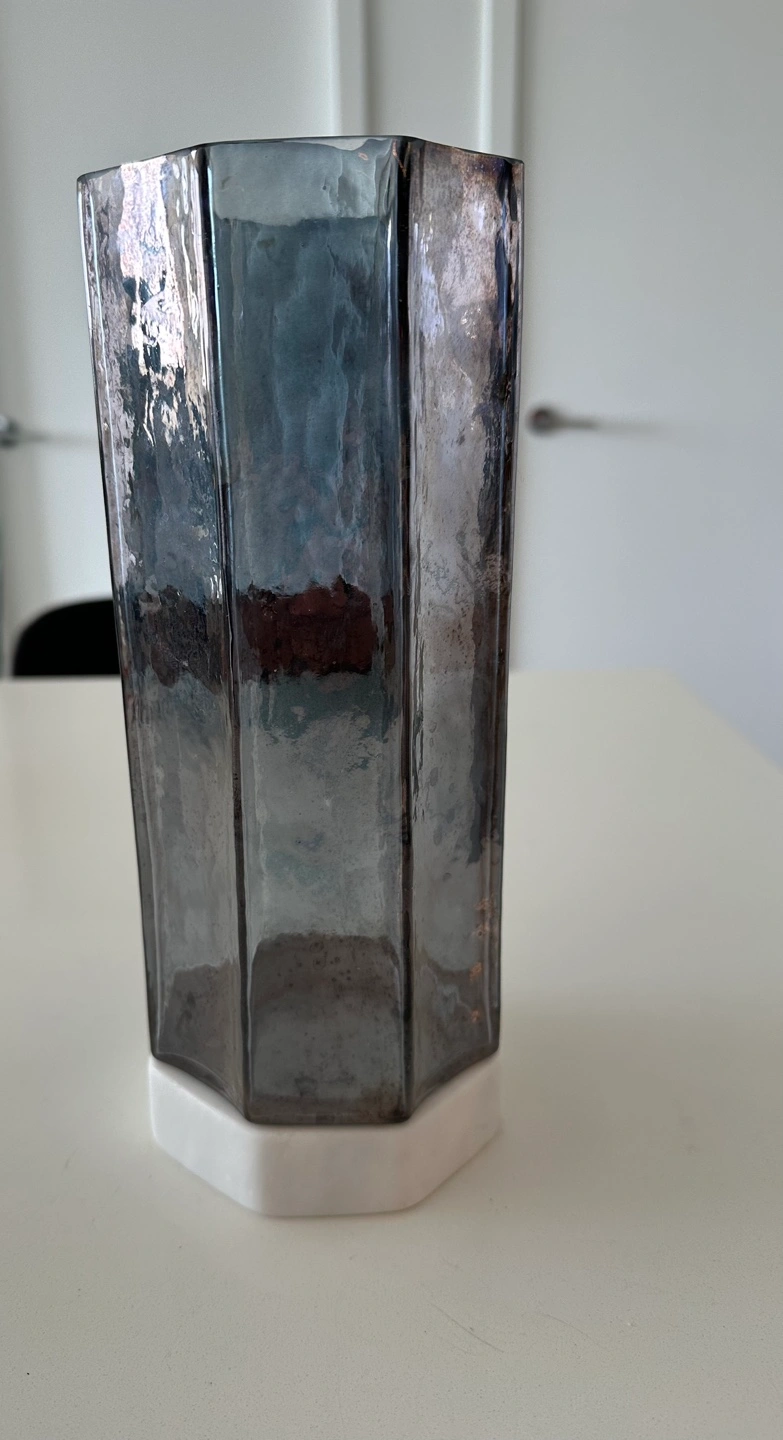Octagonal glass vase. Features a small white marble base. HomeSense brand.