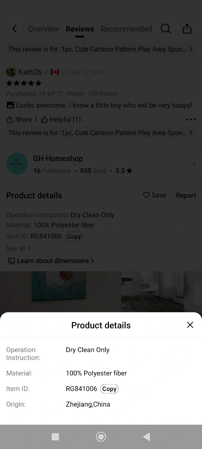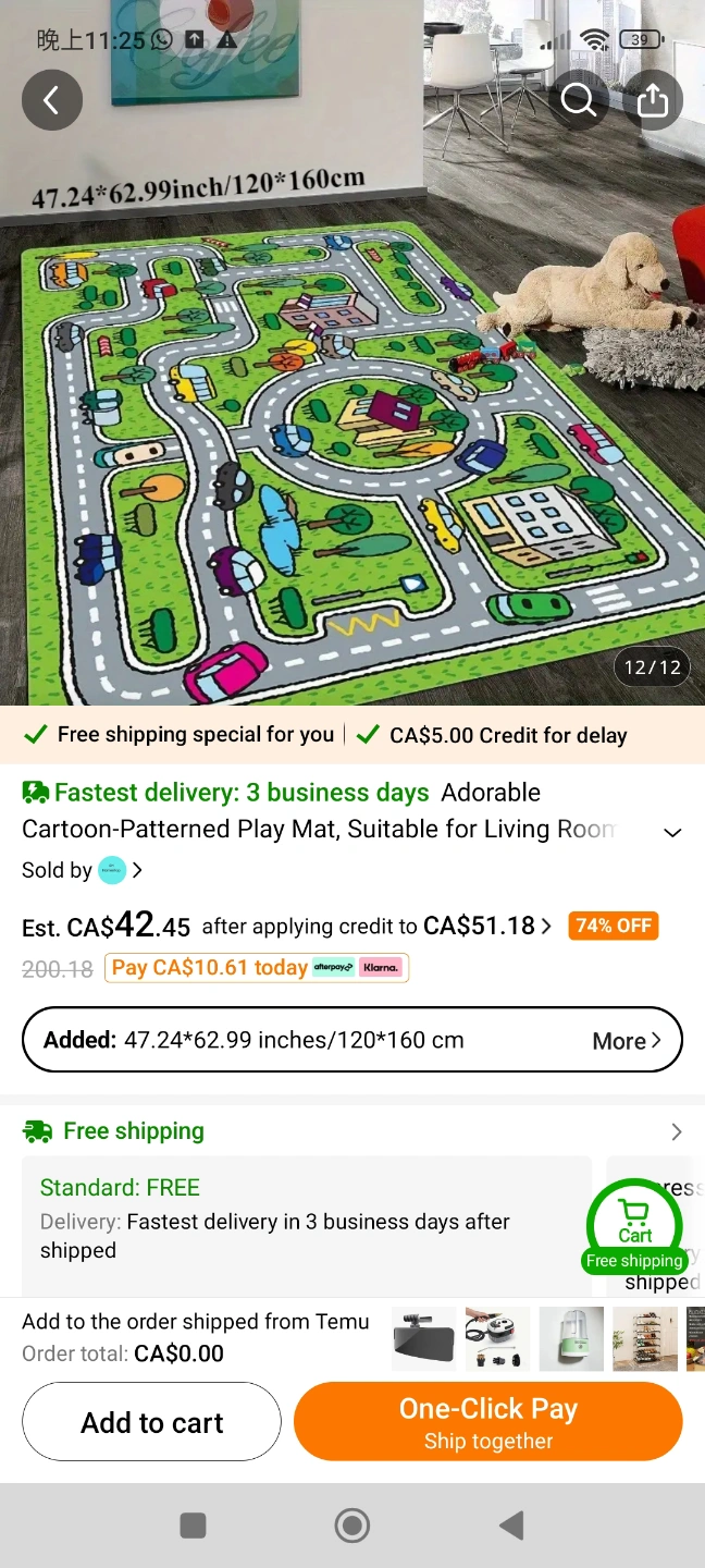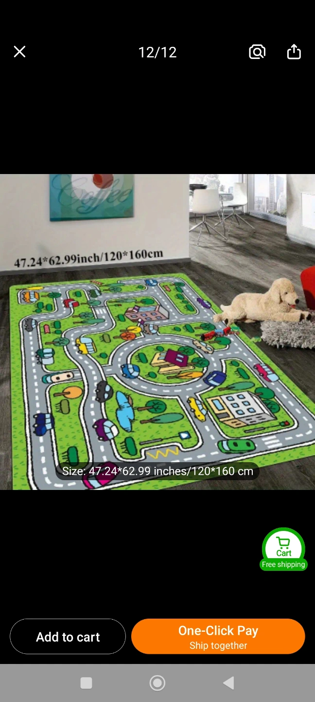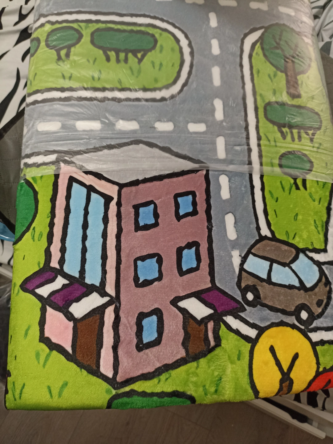 Adorable cartoon-themed play mat. Suitable for living rooms. Features a quick-dry microfiber surface and memory foam cushion. Skid-proof backing. 100% polyester fibre. Measures 120x160 cm.