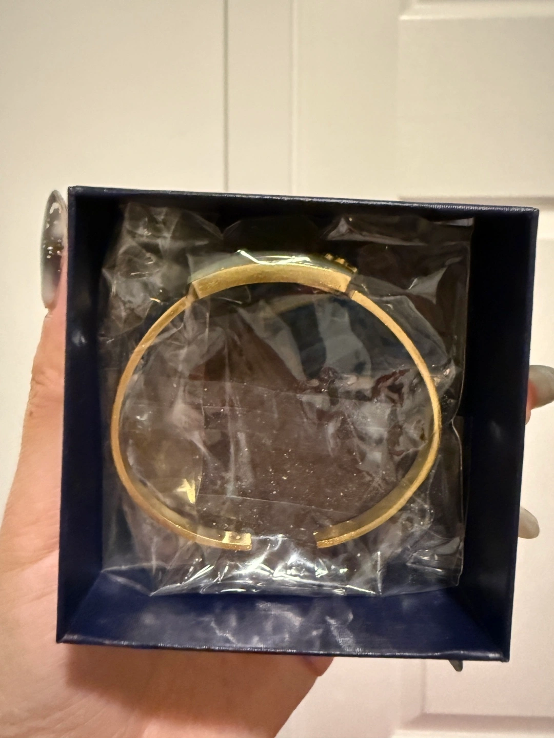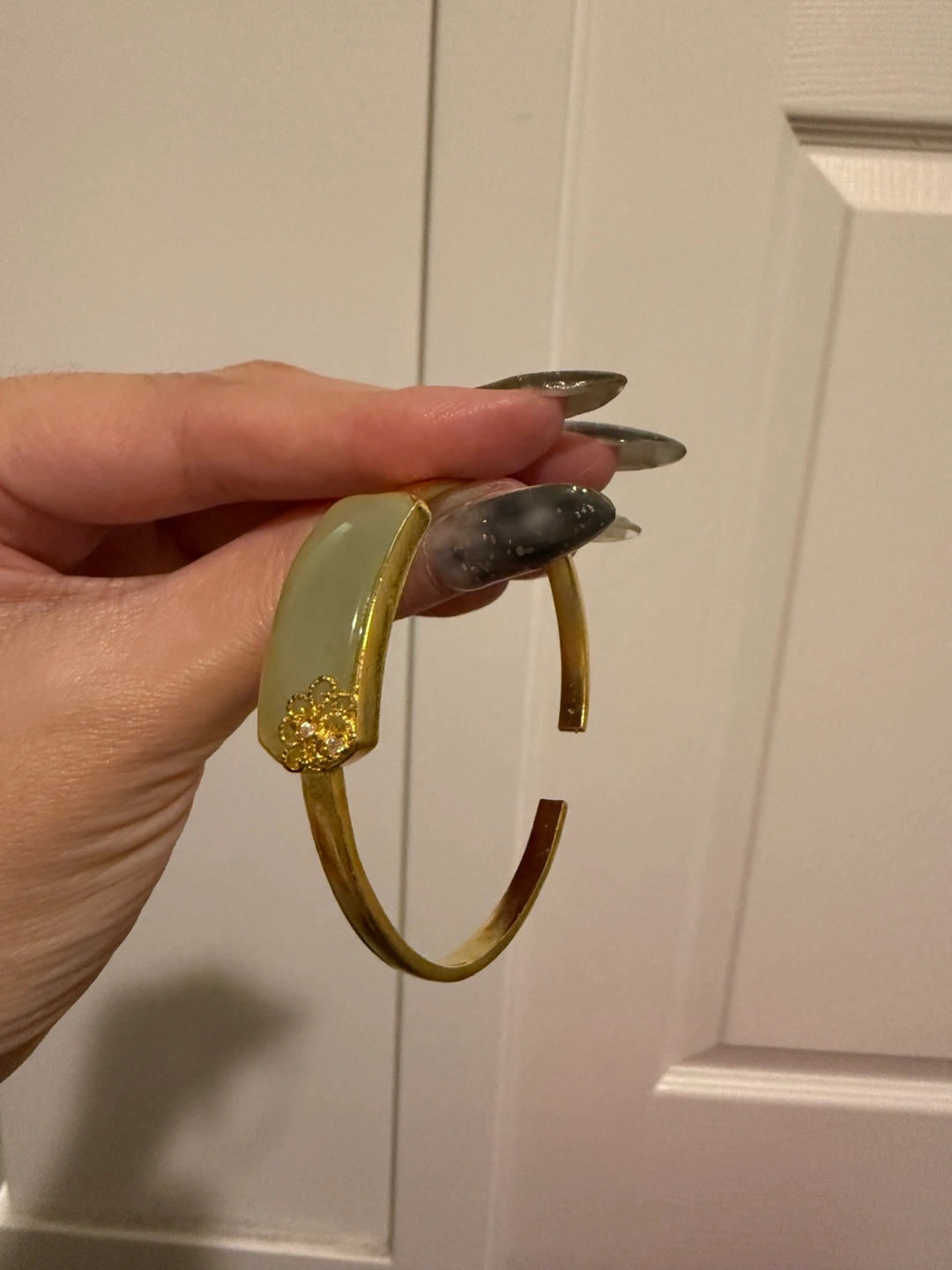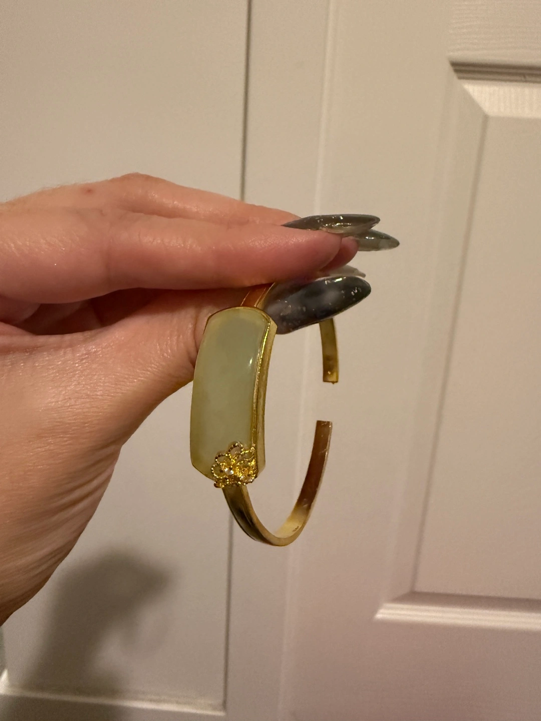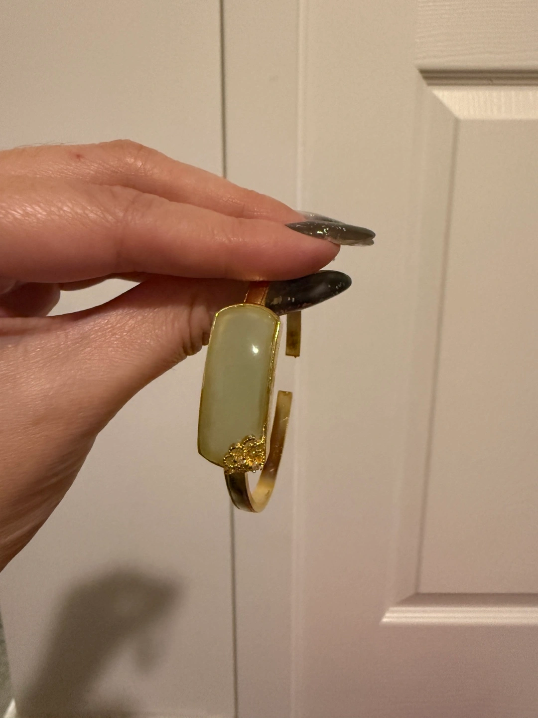 Elegant gold plated bangle bracelet. Features a rectangular green Jade accent. Comes in a navy blue box. Perfect for adding a touch of sophistication to any outfit.