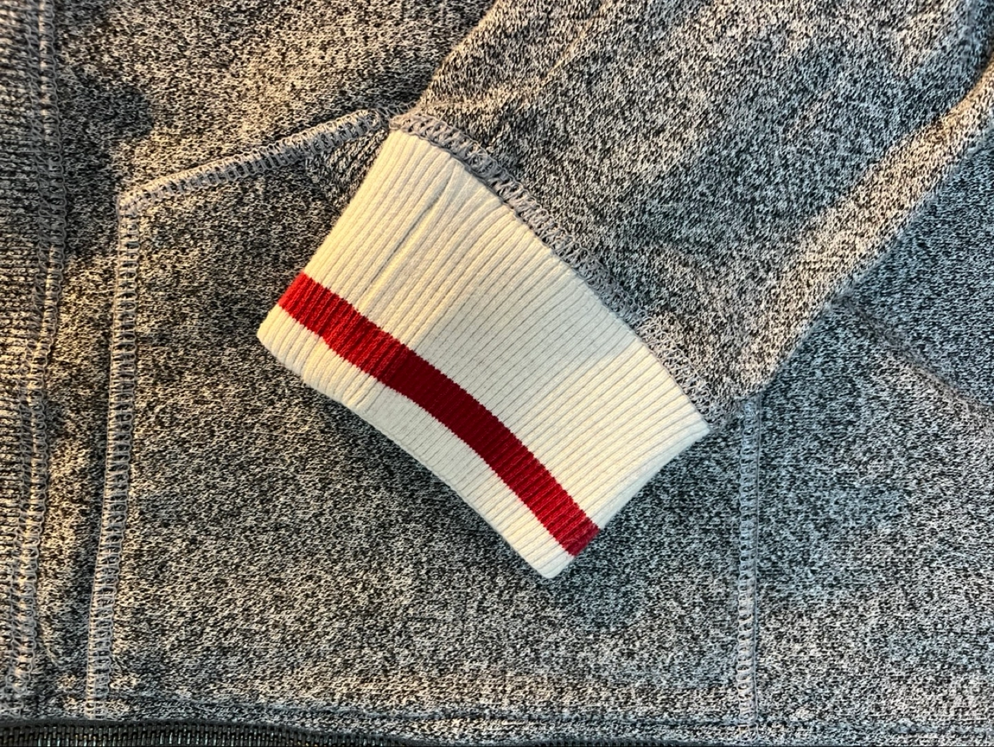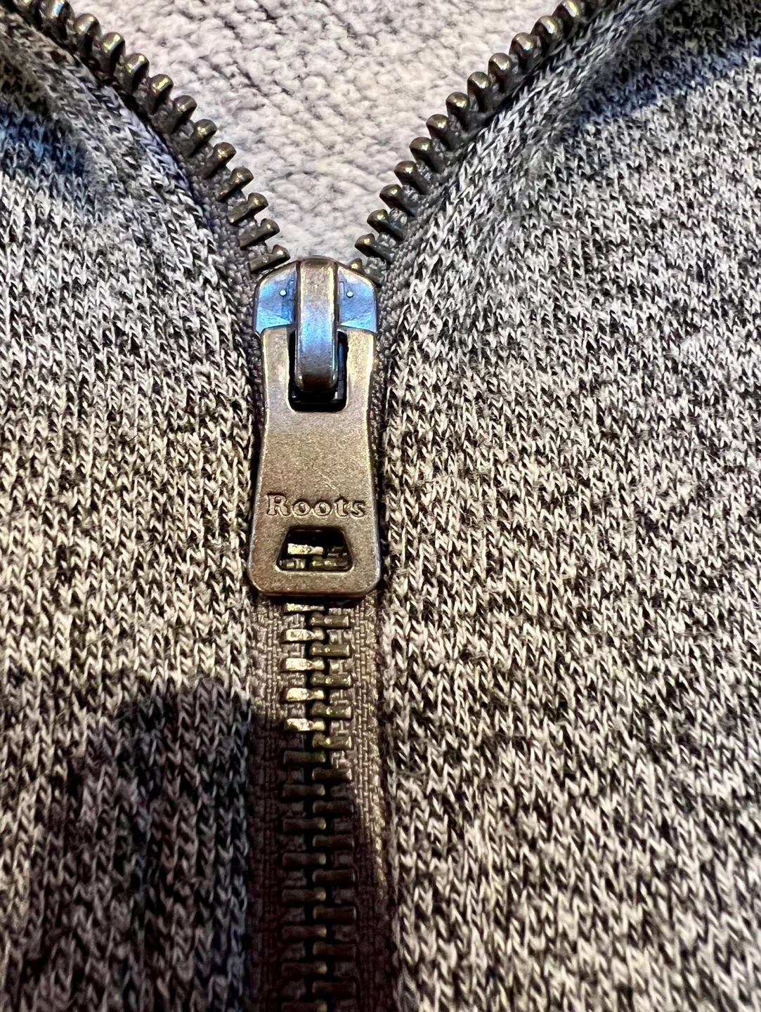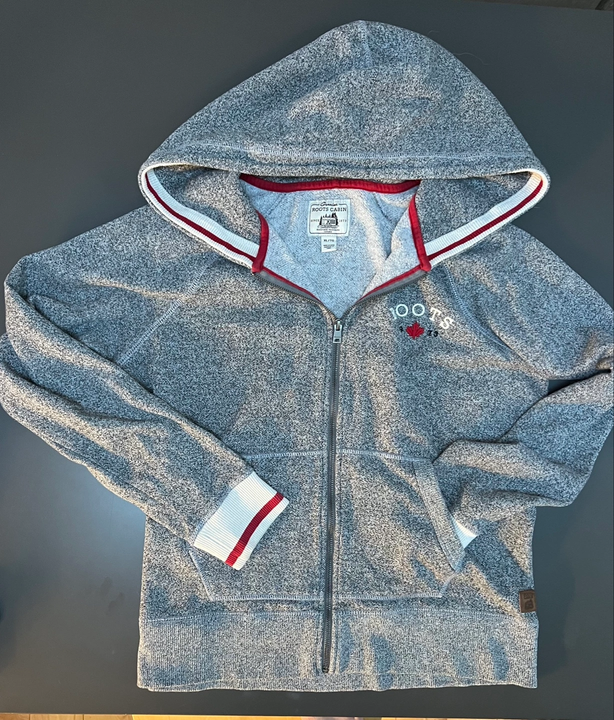 salt and Pepper heather zip-up hoodie. Features a Roots Cabin logo, red and white ribbed cuffs and collar. Size XL/TG.