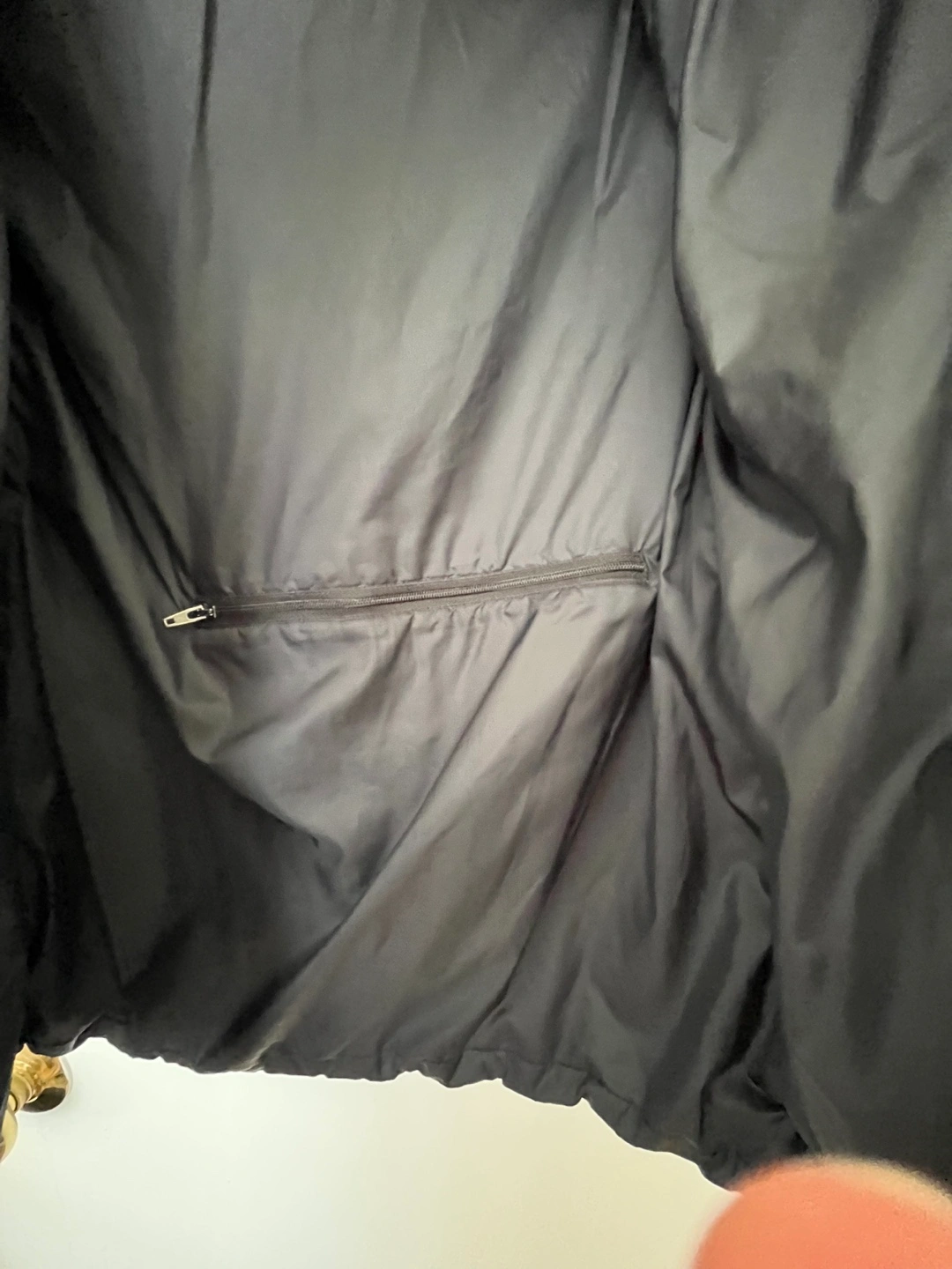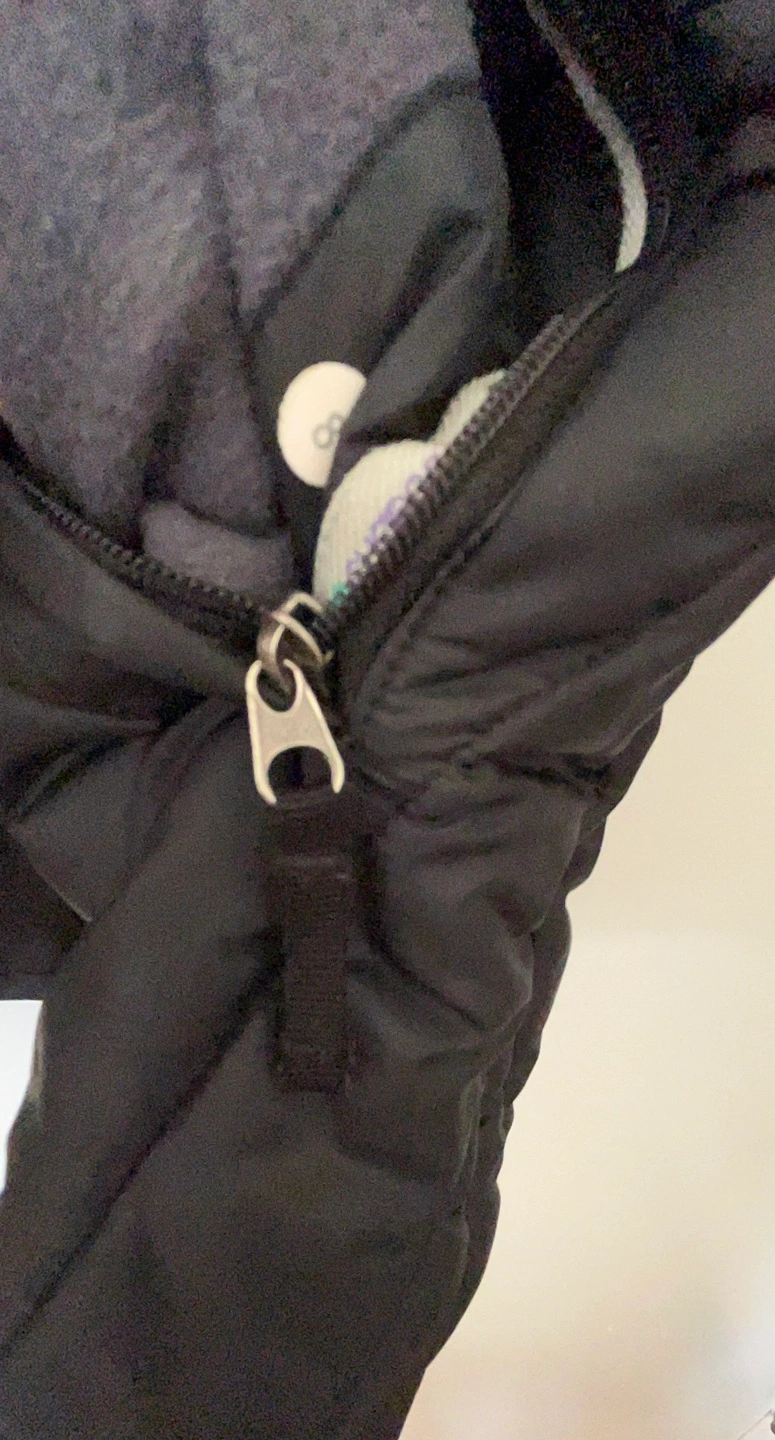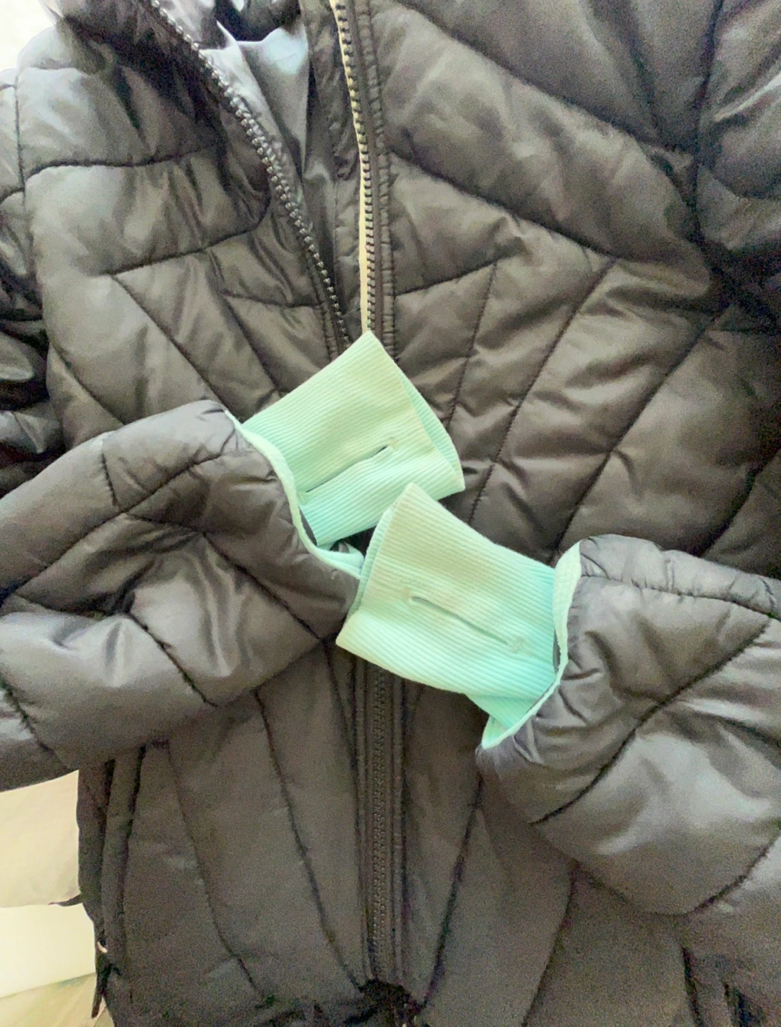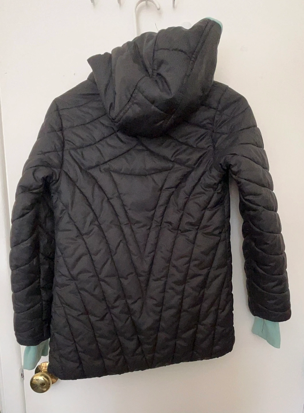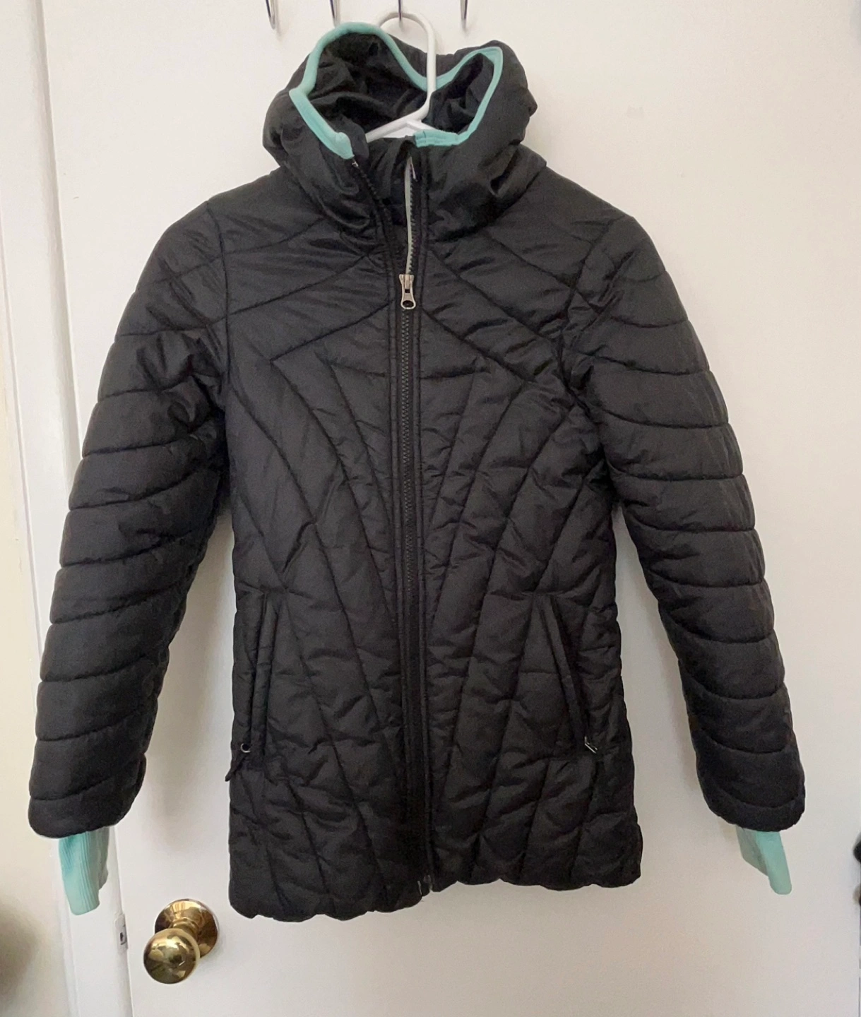 Warm winter jacket. Black quilted puffer design. Teal inner cuffs and hood lining. Zipper closure. Front pockets. Great for chilly weather. Stained on cuffs. Size 8 long winter jacket
