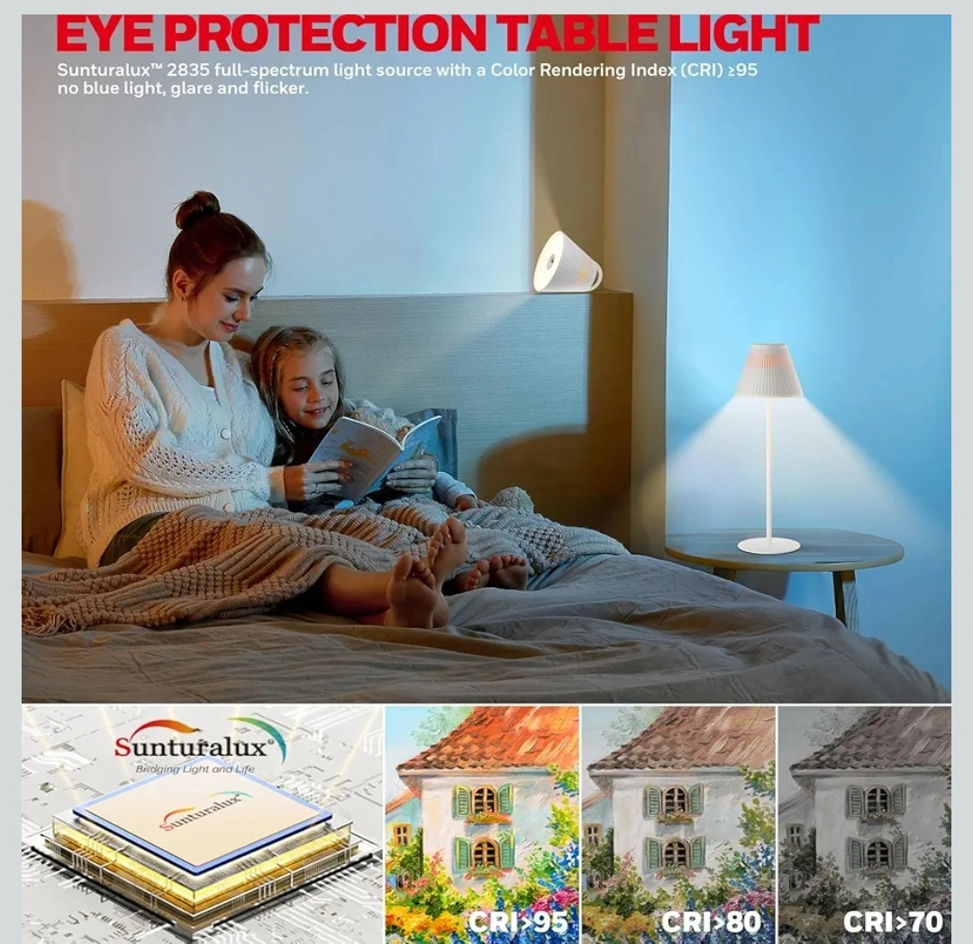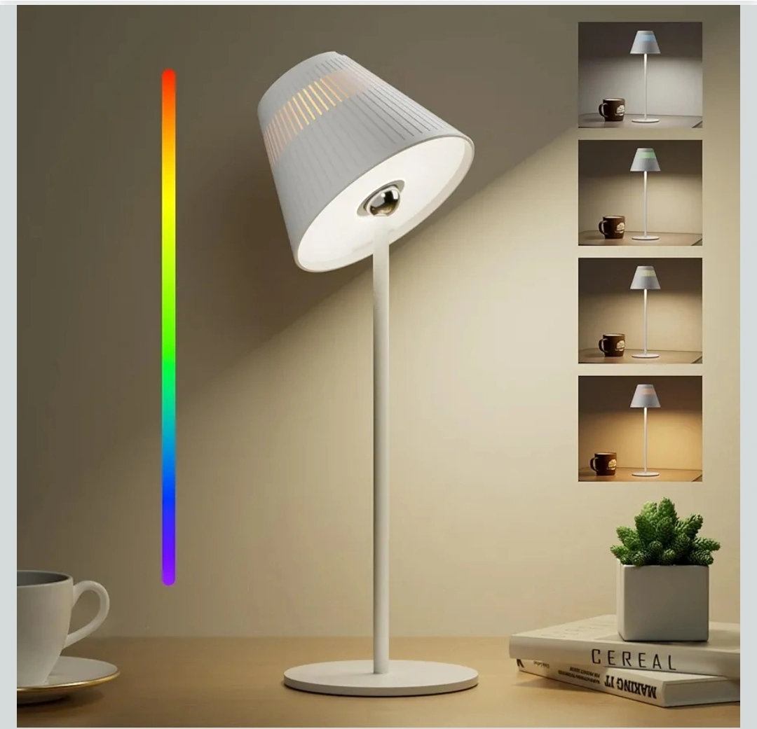 Rechargeable cordless table lamp. Features touch control, memory function, 9 RGB colours, and 4 stepless dimming colour temperatures. 5200mAh battery. Long battery life, up to 35+ hours at low brightness. 330° rotatable magnetic spherical structure. Eye protection design.