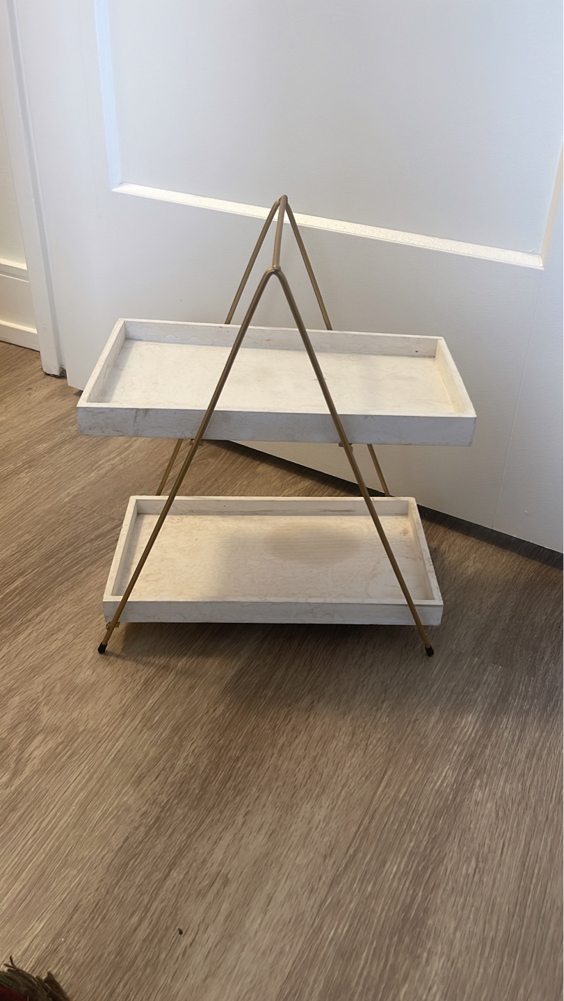 Two-tiered serving stand. Gold metal frame. White wooden trays. Great for displaying items or serving food.