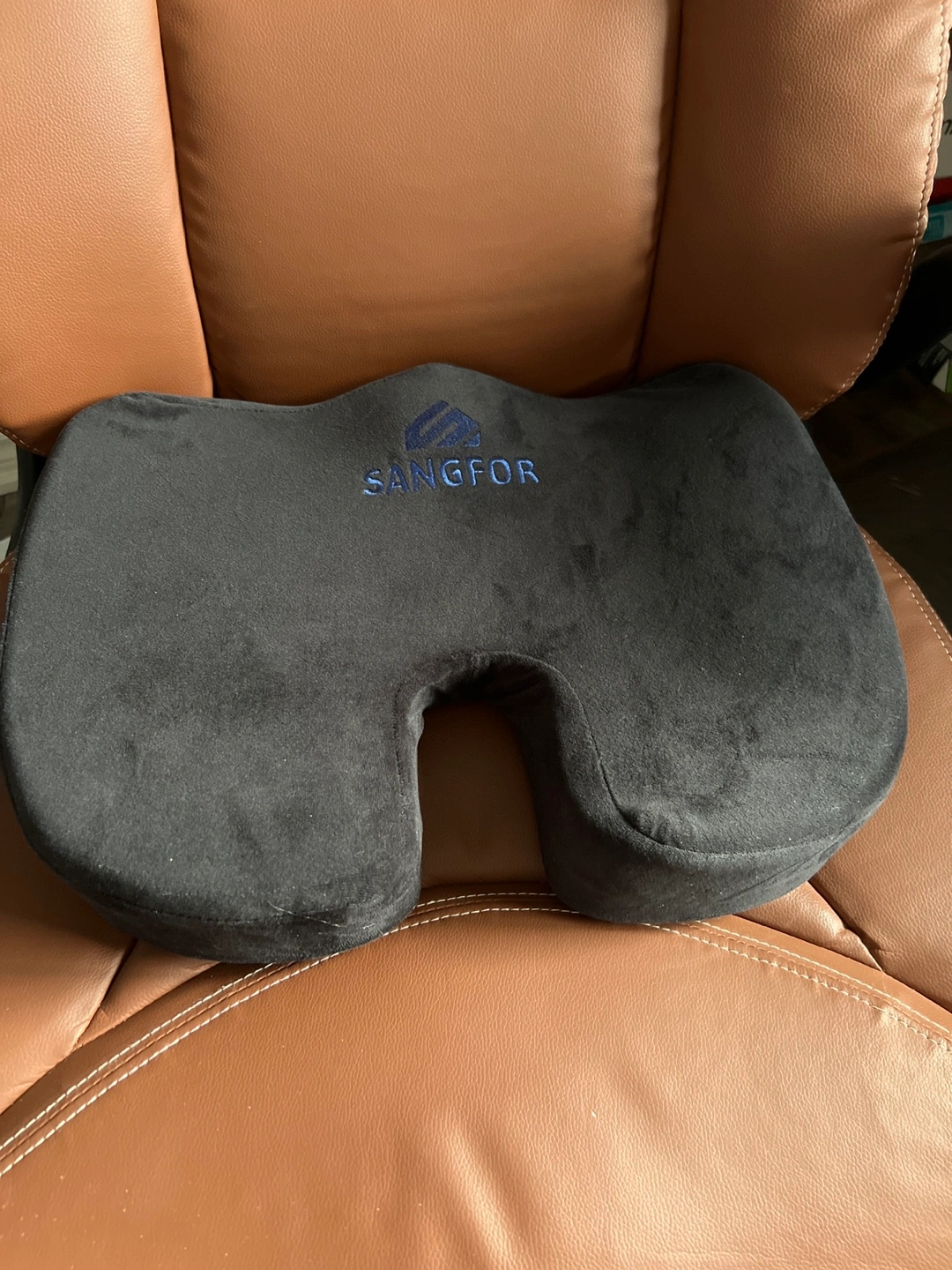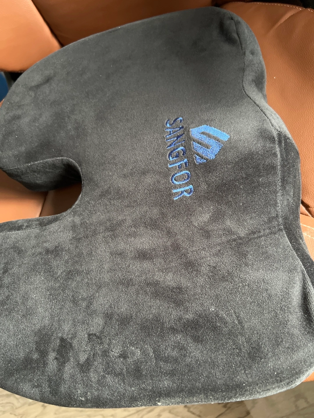 94Black velour comfort cushion. Provides tailbone support. Great for chairs and car seats. Gently used.