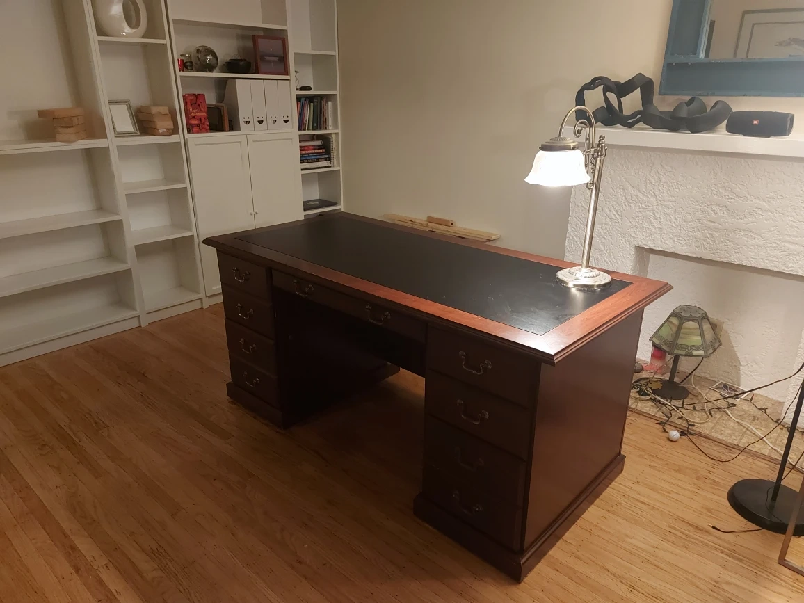 Solid wooden executive desk with nice brass drawer handles. High-quality surface, I love this desk, but it's too large after we got new furniture.