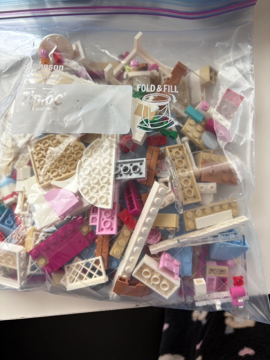 Bag of assorted LEGO pieces. Various colours and sizes. Great for building or supplementing existing sets. Includes small parts.