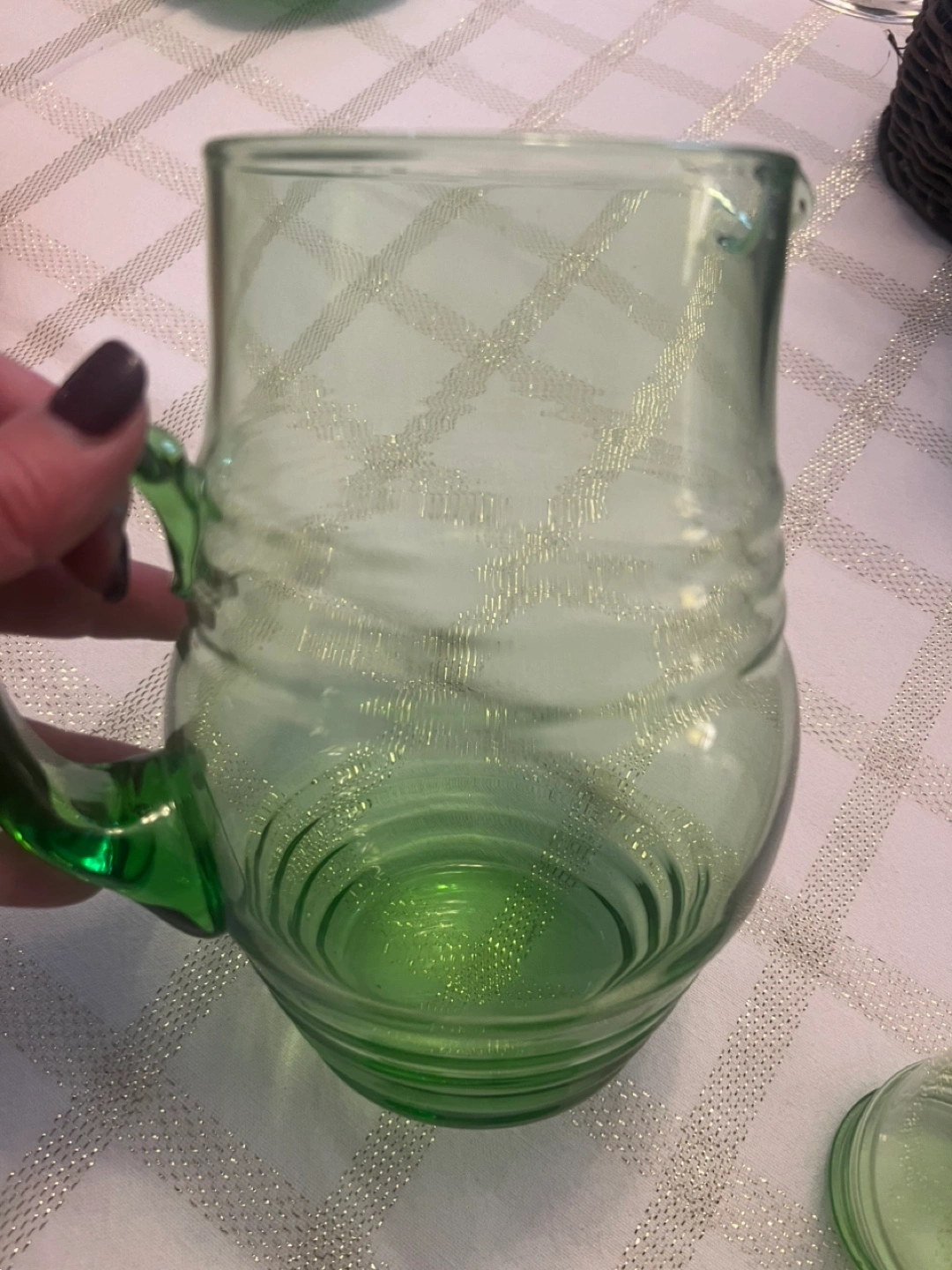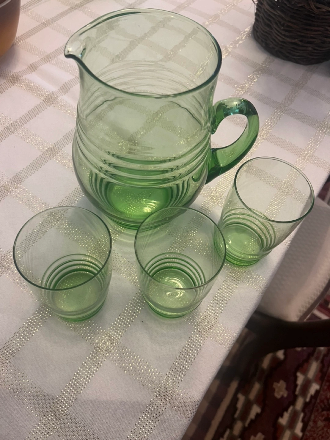 Beautiful green vintage uranium glassware set. Includes one pitcher and three tumblers. 1920's 3 glasses and one pitcher.Elegant ribbed design. Perfect for serving beverages.