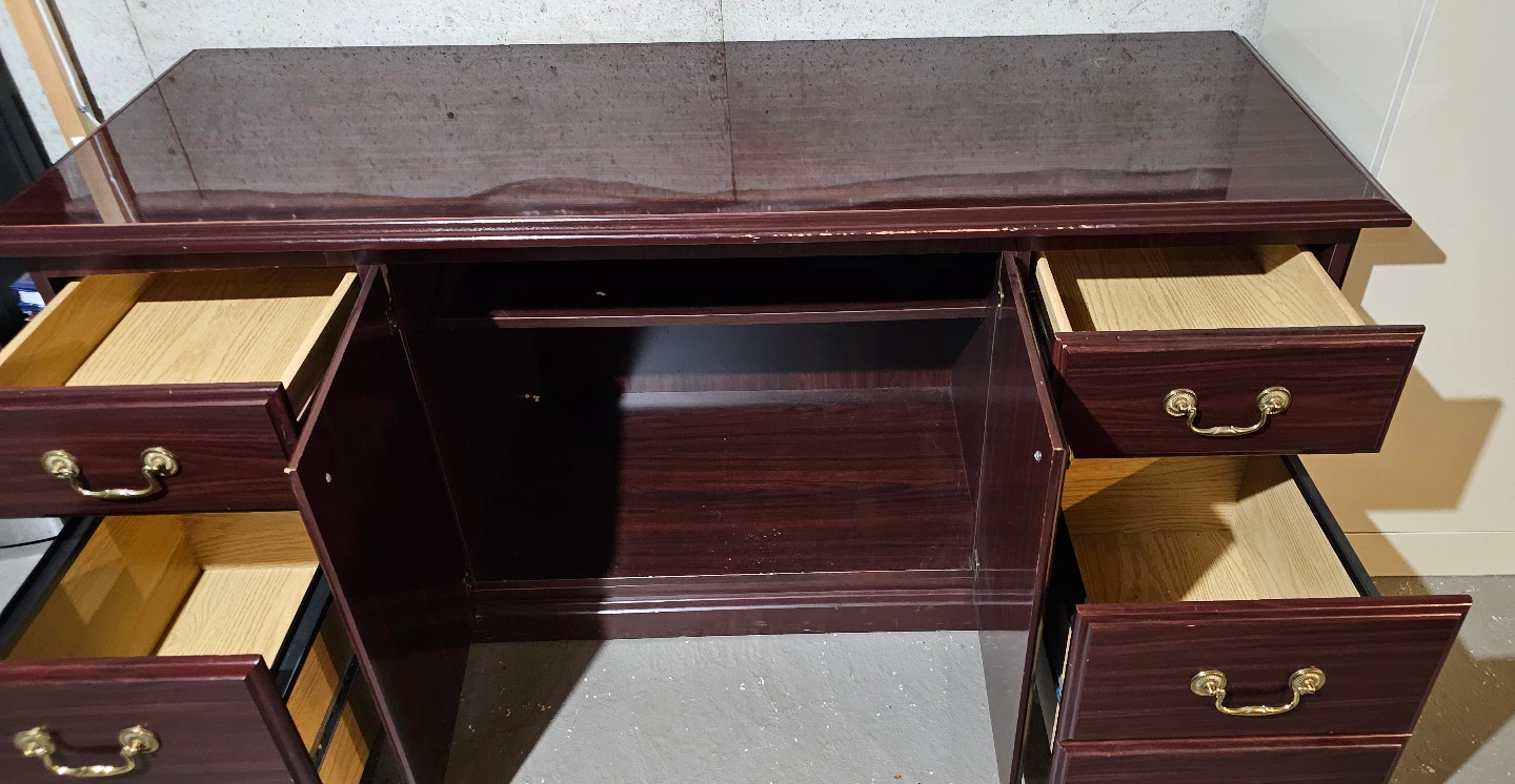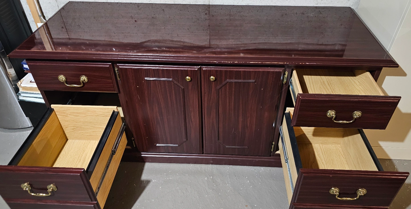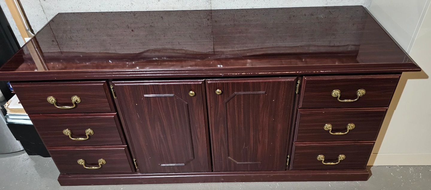 Dark brown wood lateral file cabinet. Four drawers, two cabinets with shelves. Great for office or home use. Some minor wear.