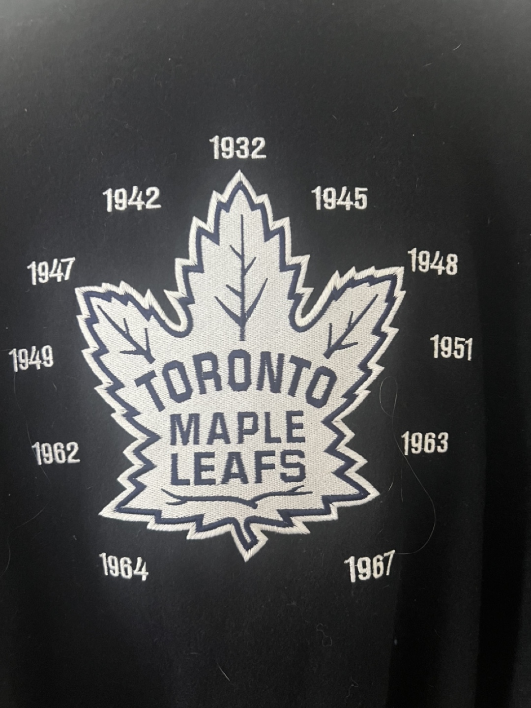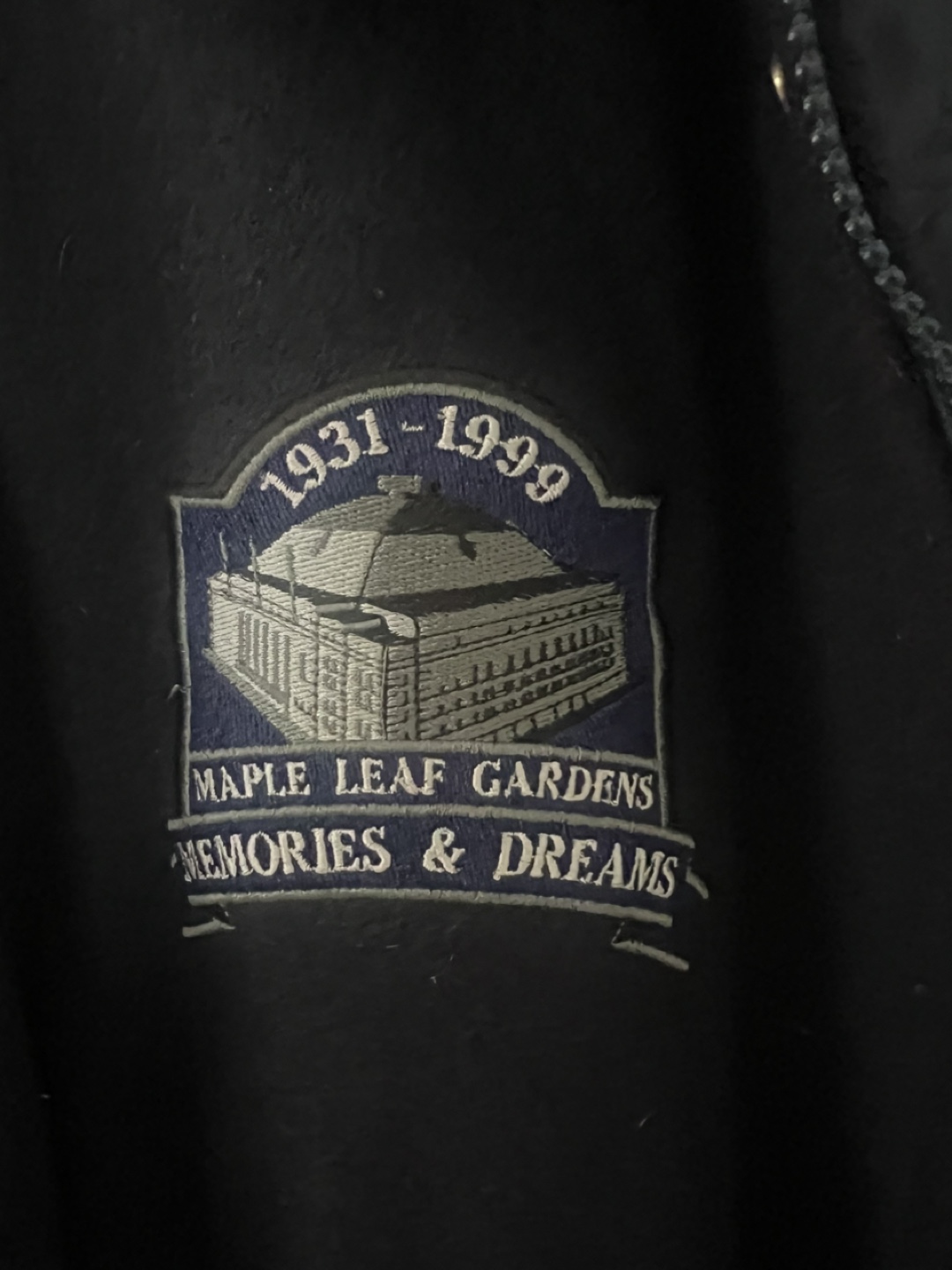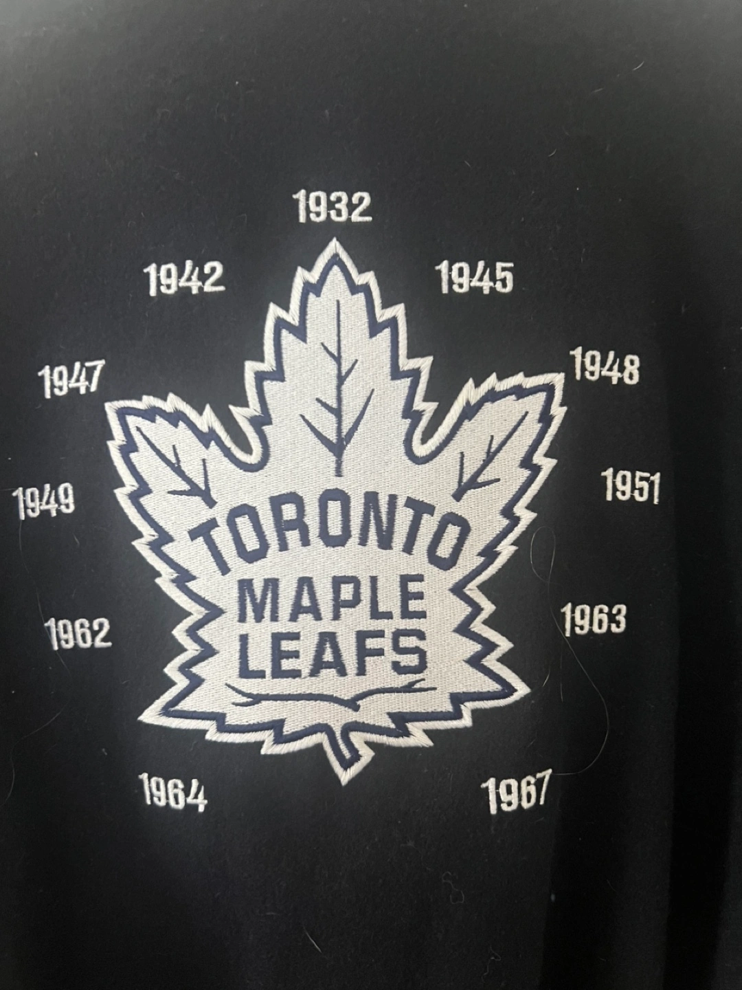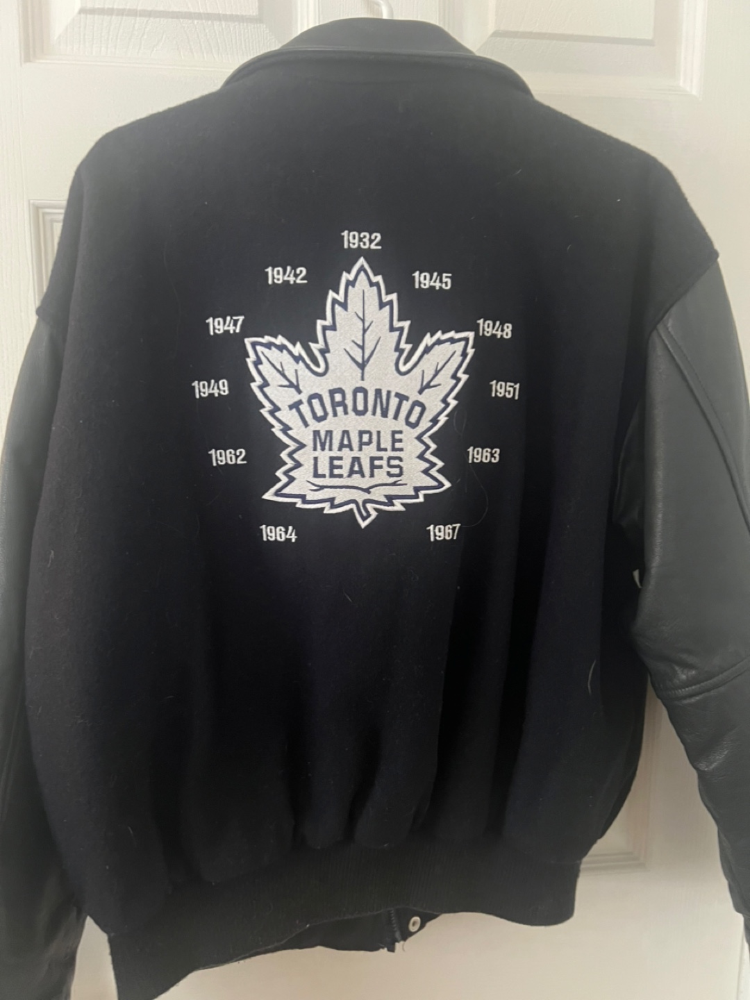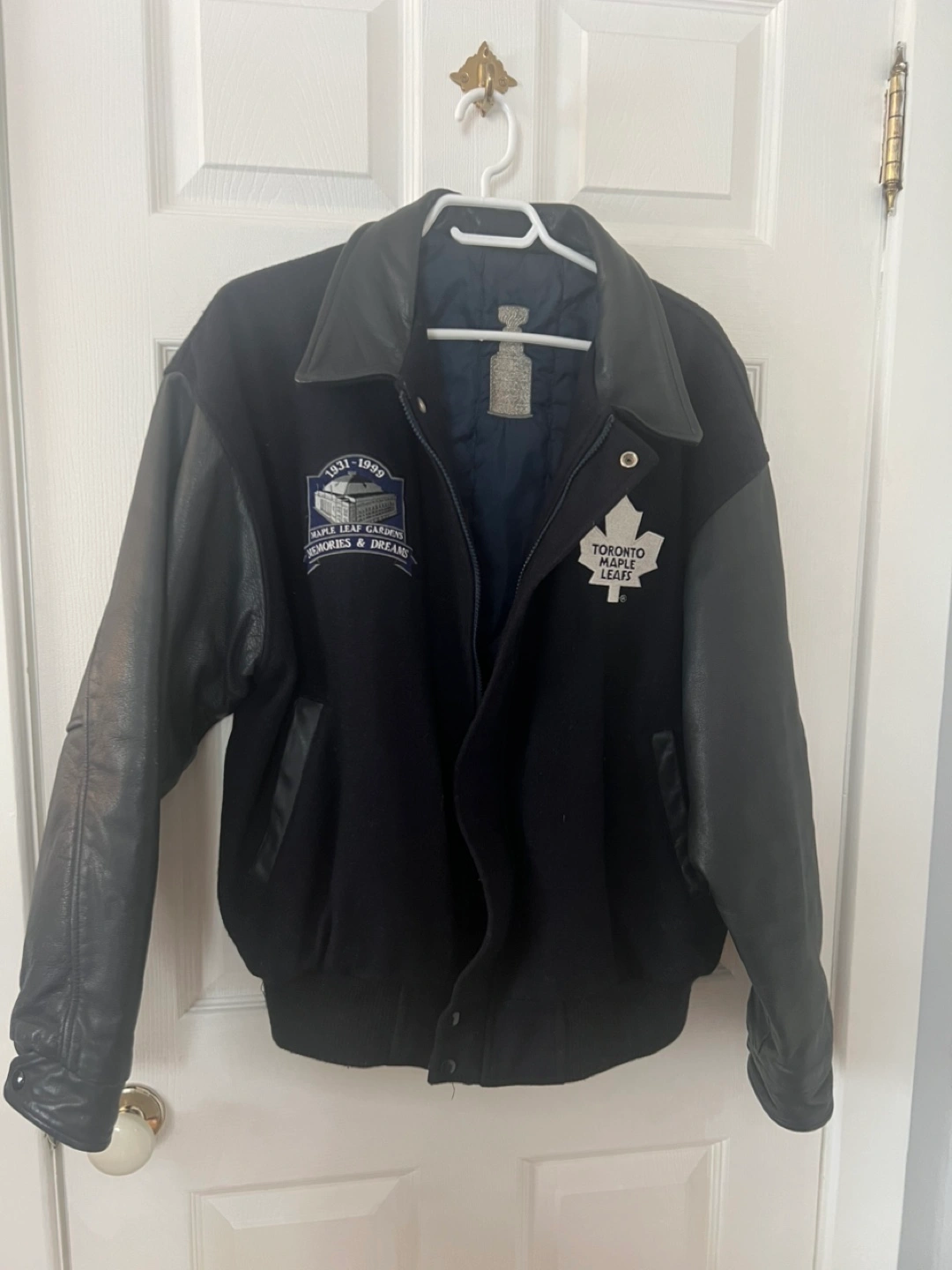 Men's black leather wool varsity jacket. Features Toronto Maple Leafs logo and years of Stanley Cup wins. Leather sleeves. Maple Leaf Gardens commemorative patch. Excellent condition.