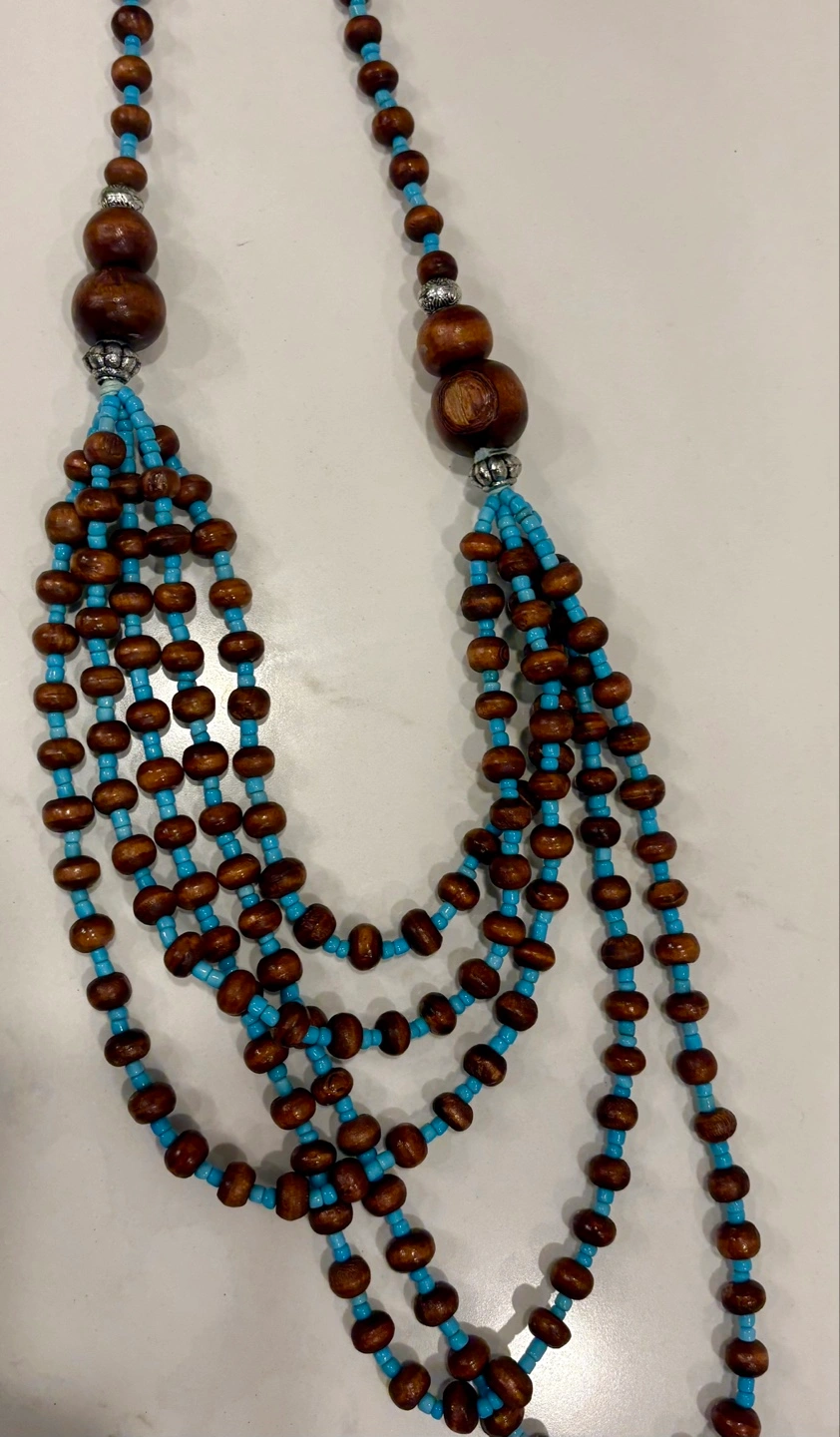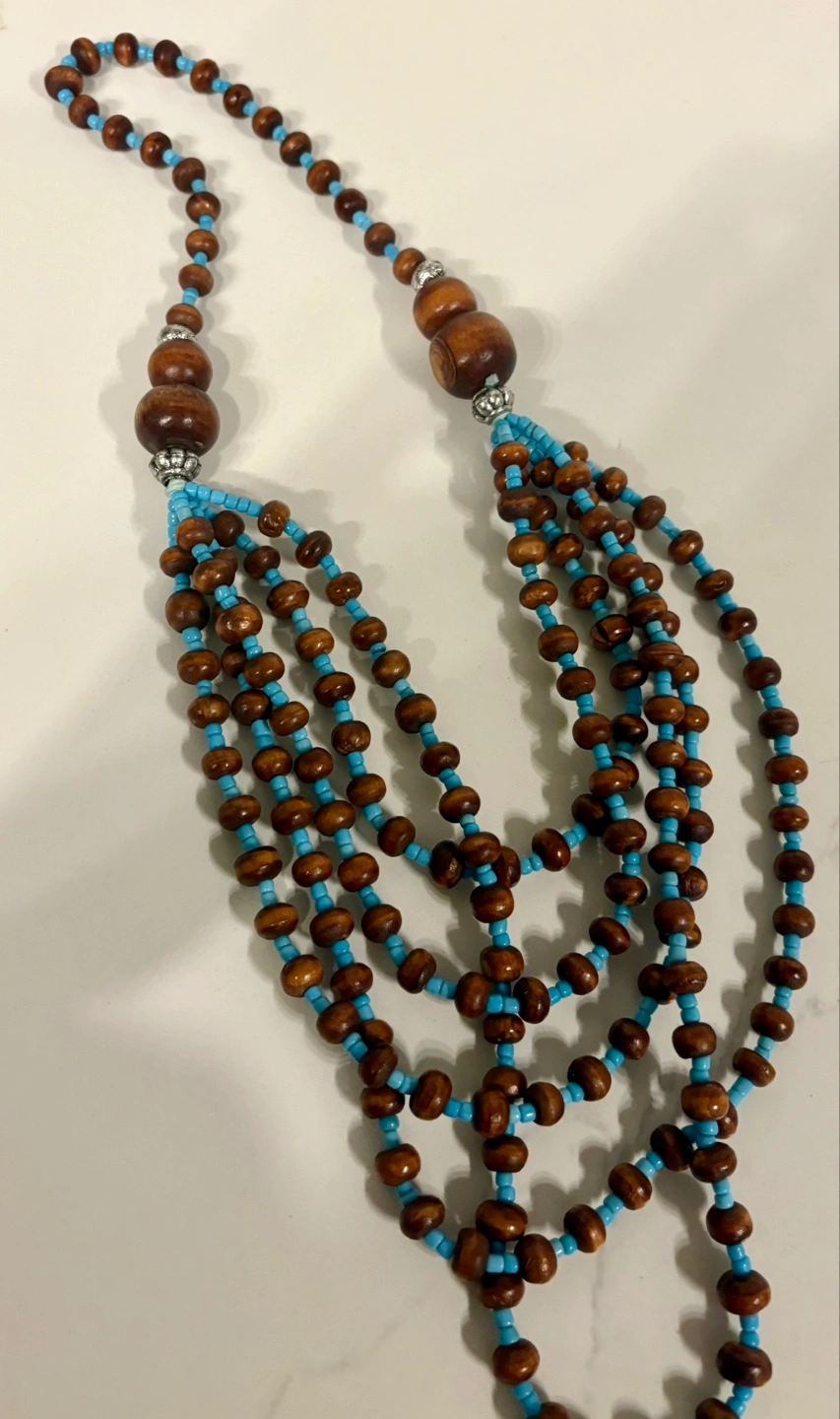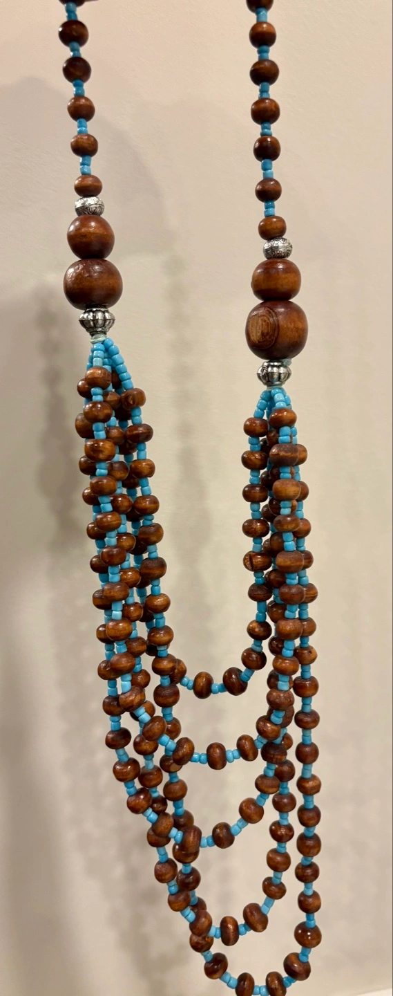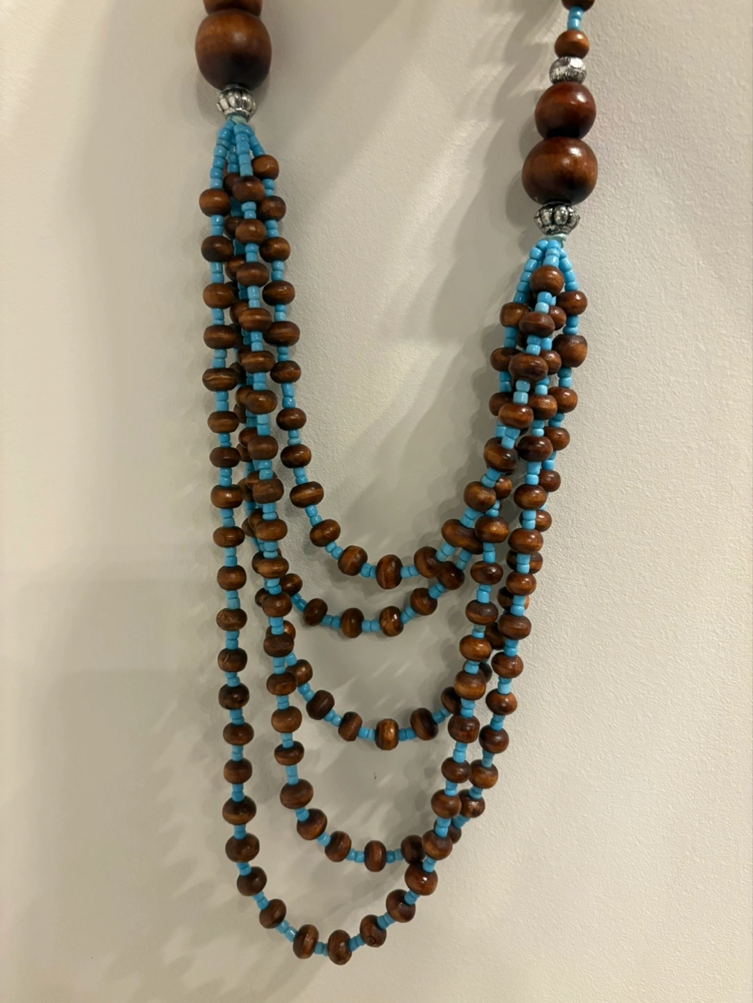 Beautiful multi-strand necklace. Features brown wooden beads and light blue accents. Longer length. Great for layering or wearing alone.