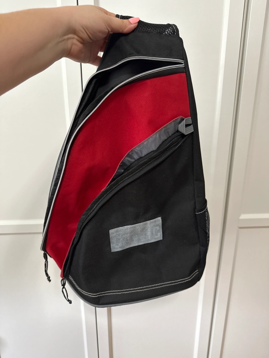 Small sling bag. Black and red colour scheme. Multiple pockets. Adjustable strap. Great for everyday use.