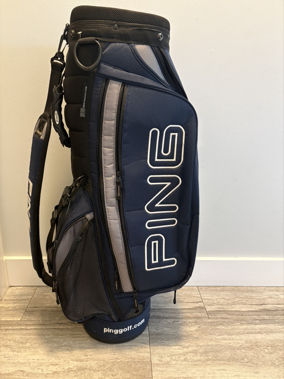 PING golf stand bag. Navy blue with grey accents. Multiple pockets and compartments. Good condition. Lightweight and easy to carry.
