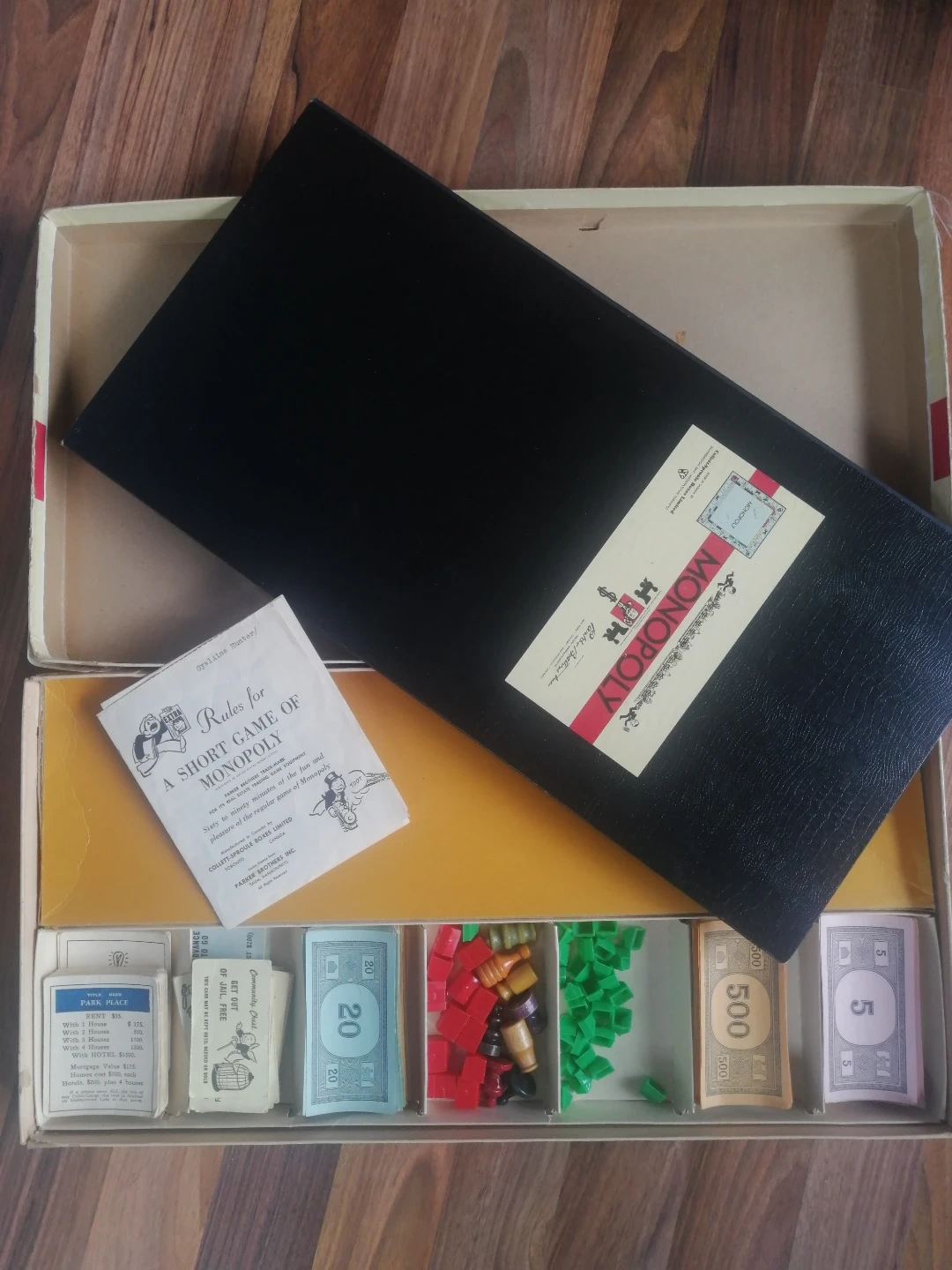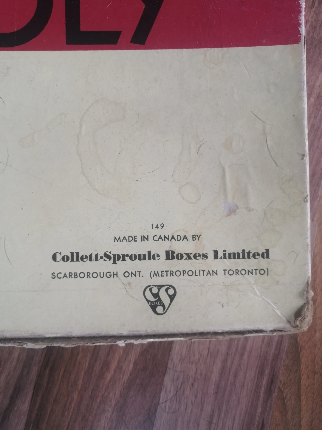 Vintage Monopoly board game. Includes game board, pieces, cards, and money. Only the dice are missing. Made in Canada by Collett-Sproule Boxes Limited. Box shows