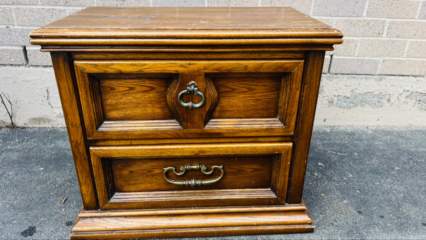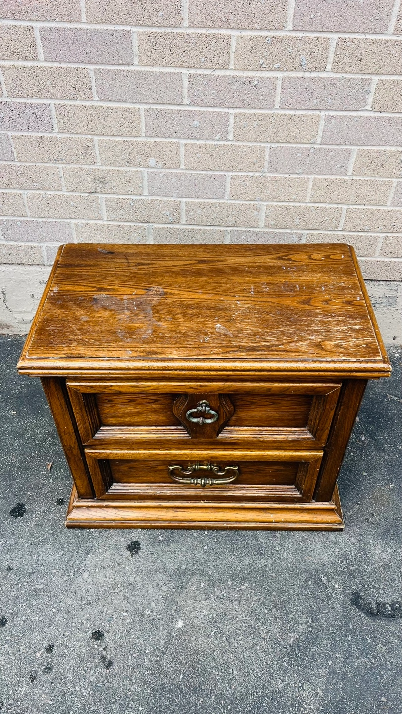 Solid wood nightstand. Two drawers, ornate hardware. Shows wear consistent with age and use. Perfect for a bedroom or as a small storage piece.