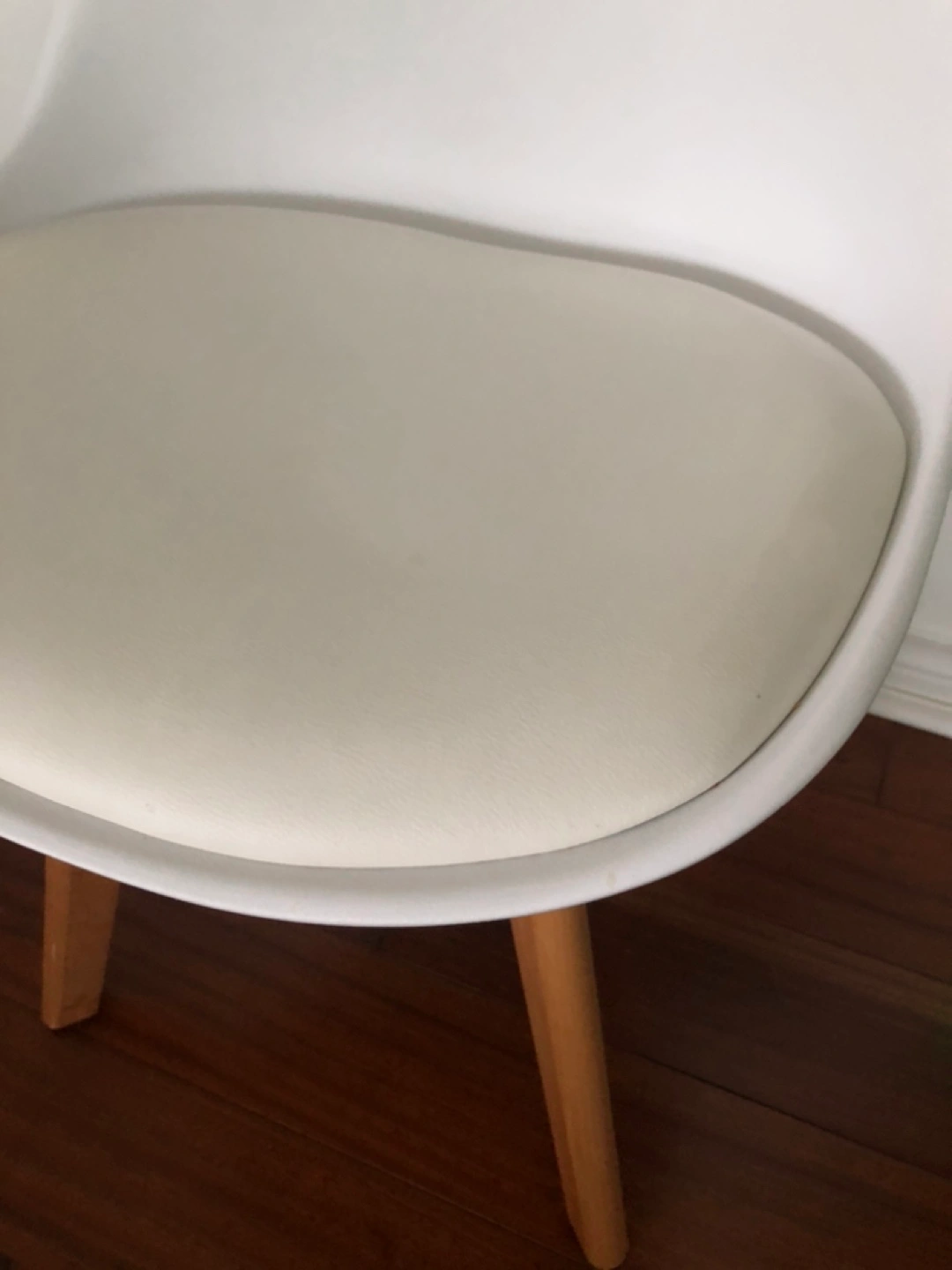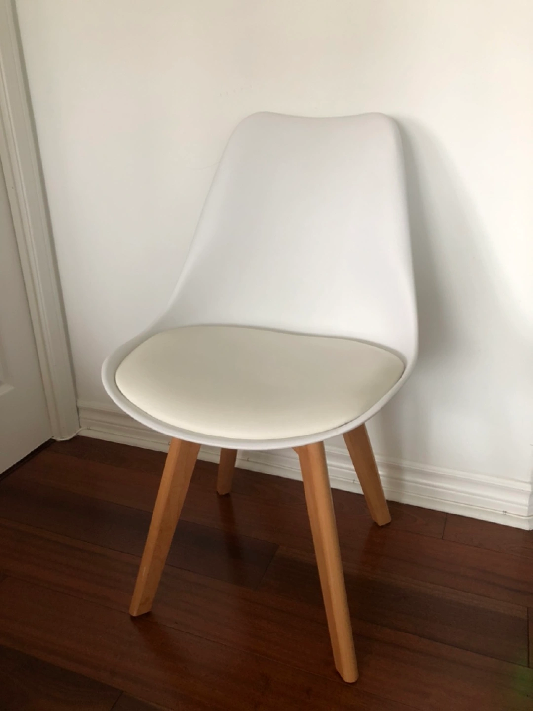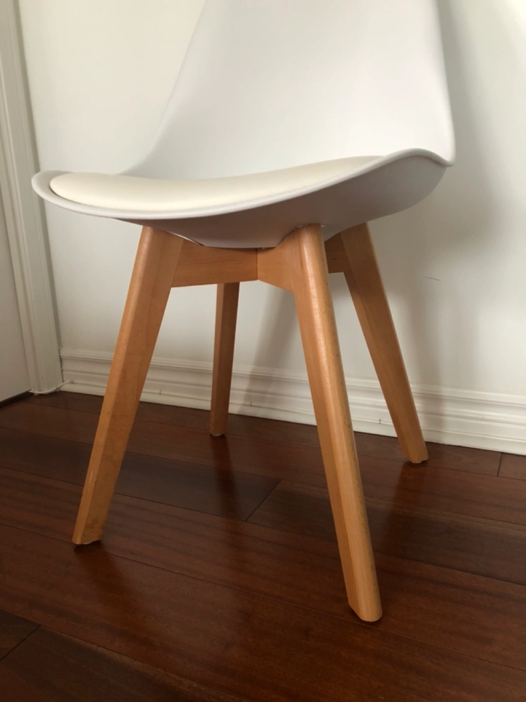 Stylish and comfortable chair. White plastic shell with off-white cushion. Light wood legs. Great for kitchen or dining room.
