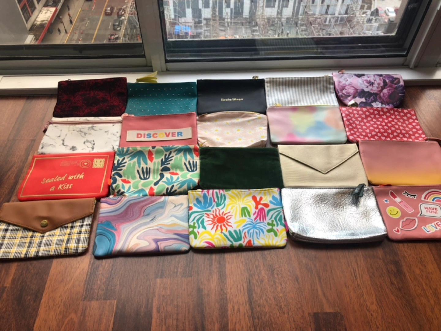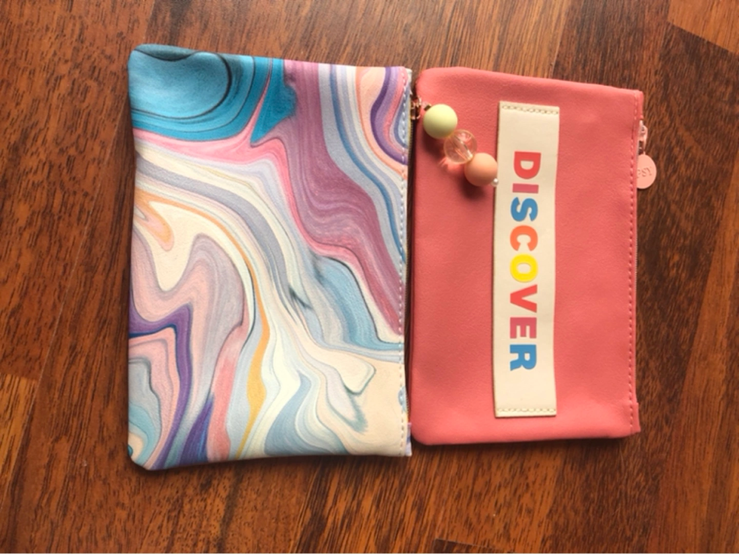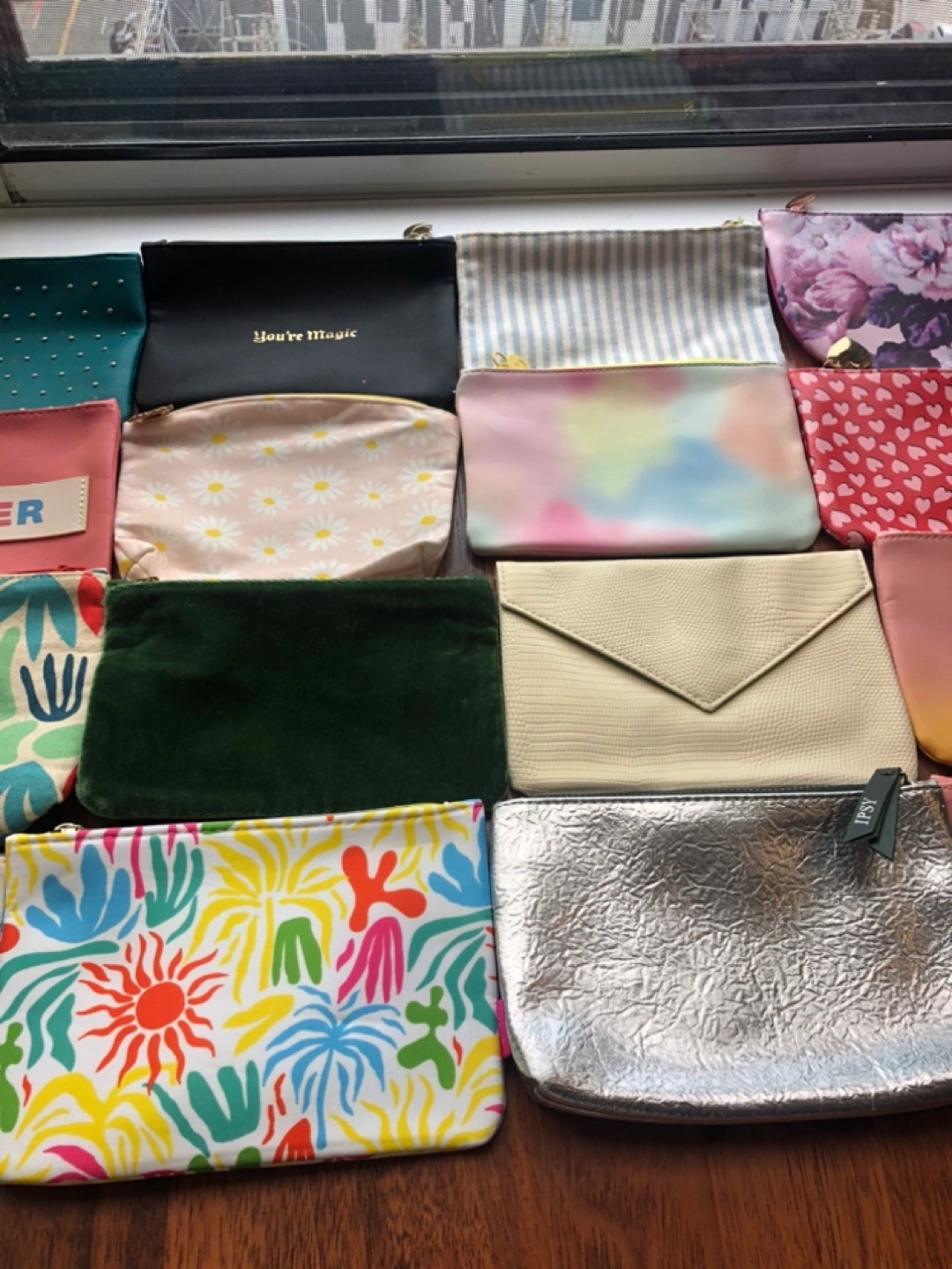 Variety of cute and colourful cosmetic bags. Perfect for travel or everyday use. Zipper closures. Different patterns and designs. 3$ each or 15$ for all