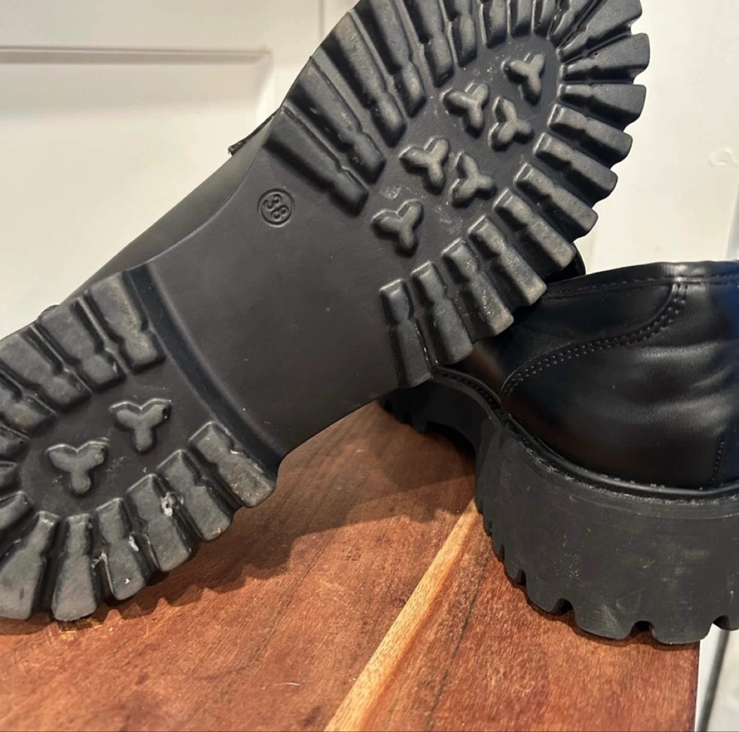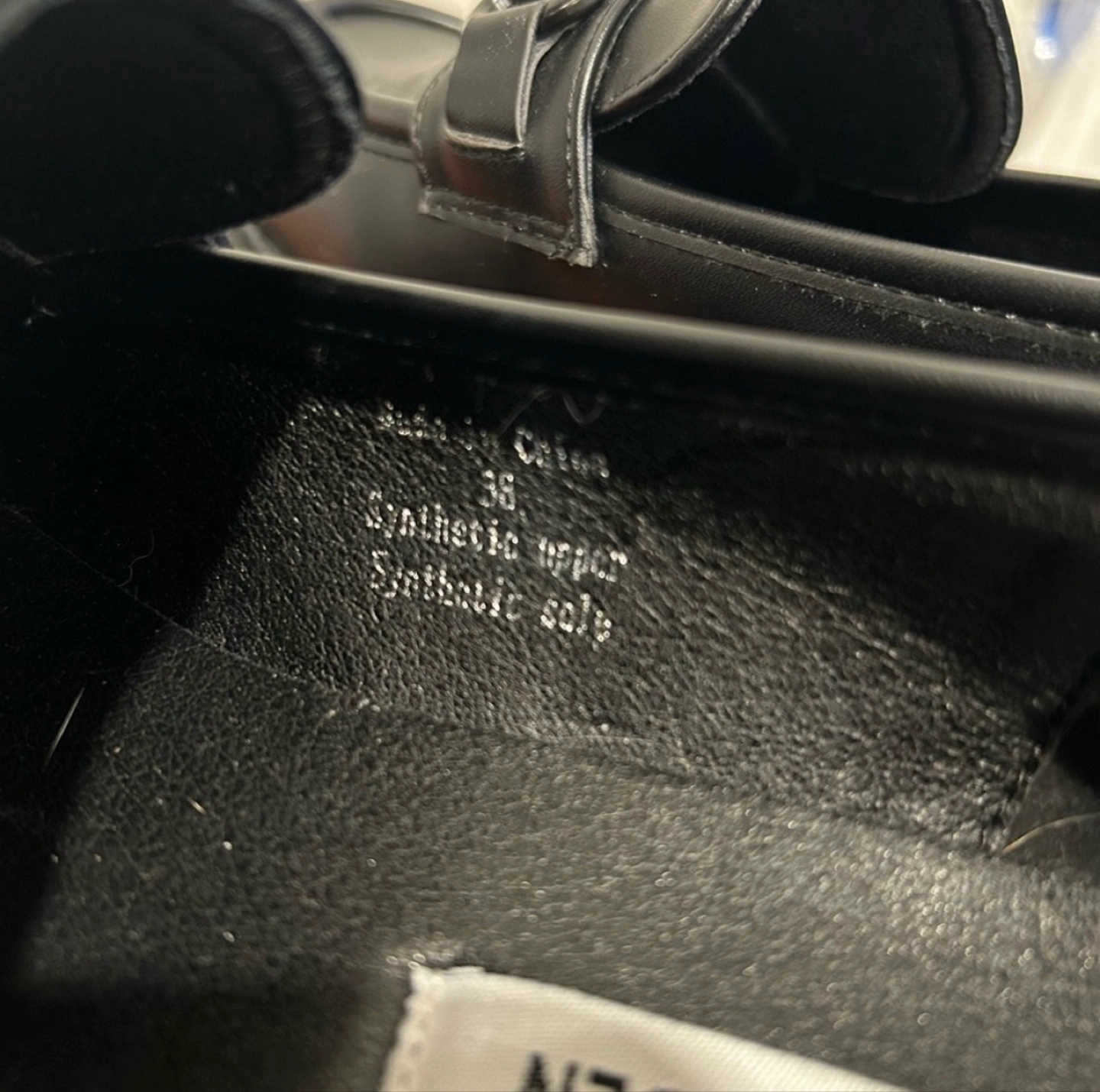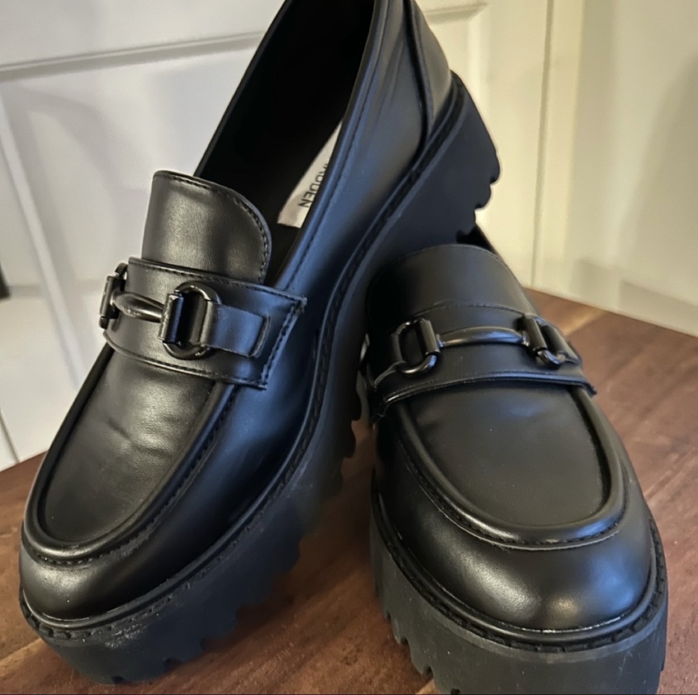 Women's black loafers with platform sole. Synthetic upper and sole with metal accents.