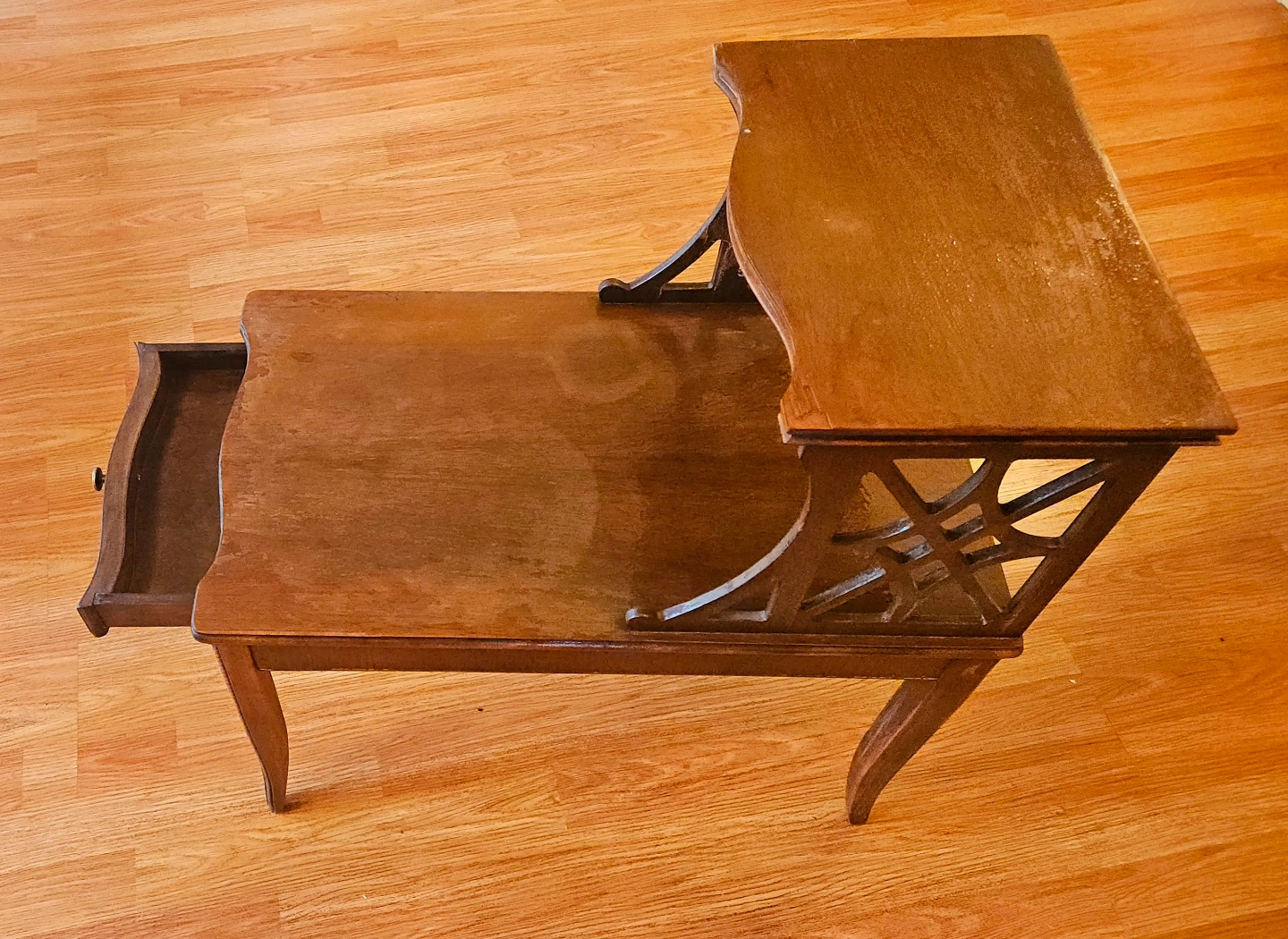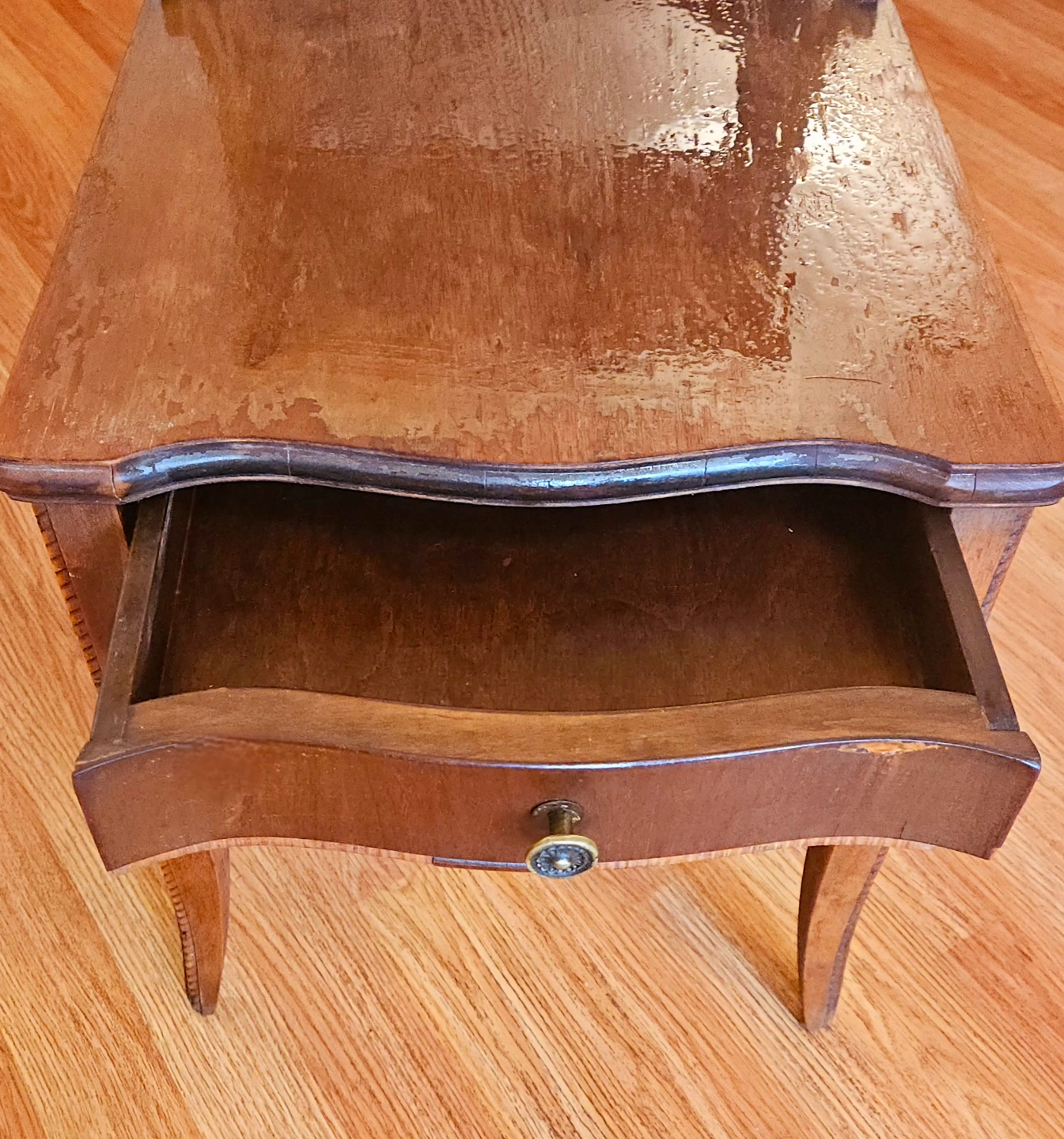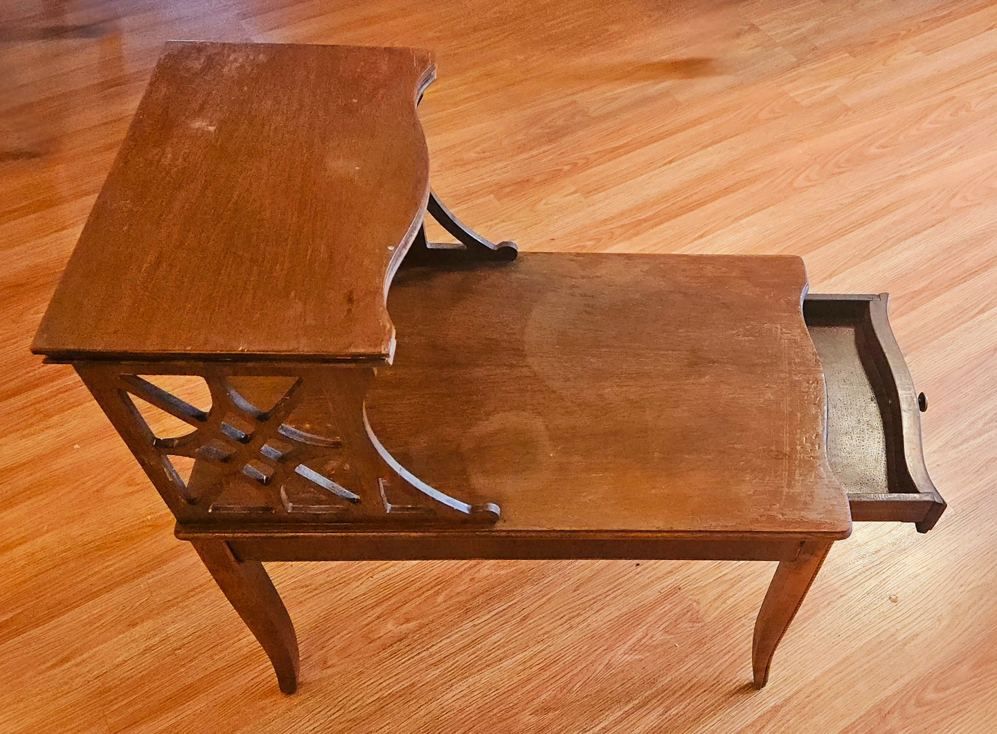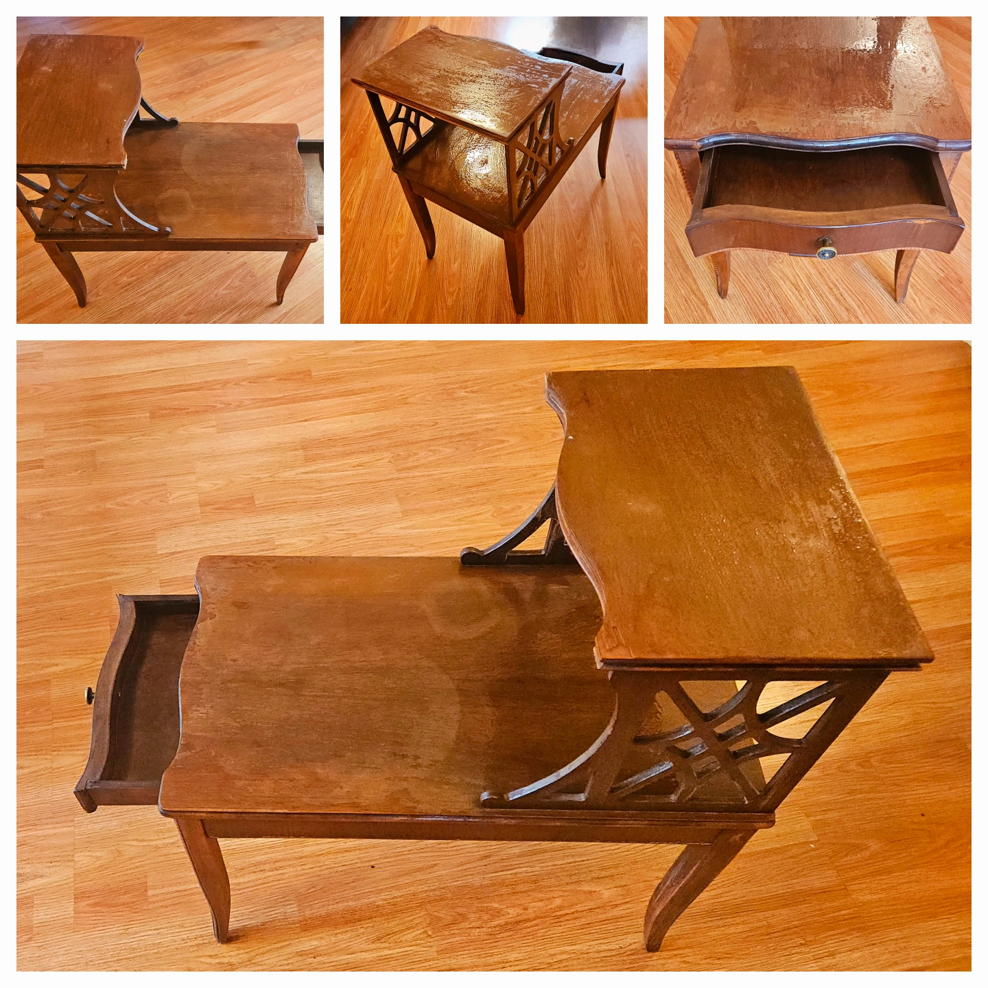 1000+Charming vintage end table. Features two tiers and a functional drawer. Beautiful timeless design. Solid wood construction. Shows some signs of age and wear, but that actually adds value. For a face-lift, you can sand and polish too. Perfect for a retro or vintage-inspired space. This item is from a smoke-free, pet-free home. Bundle discounts are available—check out my other listings. Thank you! 😊🙏