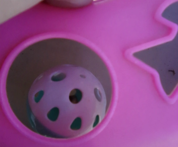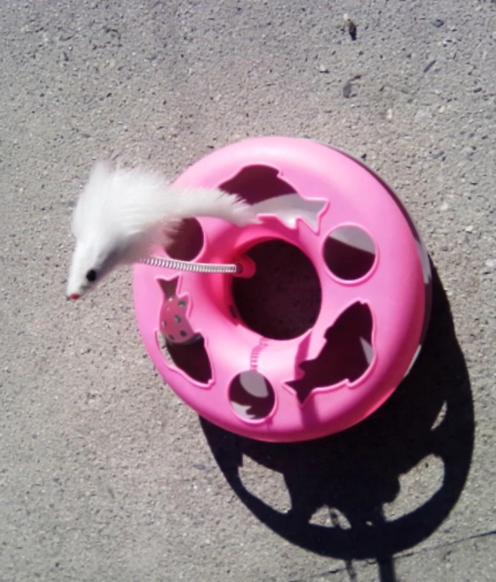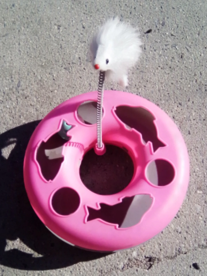 Fun cat toy. Pink plastic base with cutouts. Rolling ball inside. Feathery mouse teaser on a spring. Great for interactive play. Pickup in Astoria Queens.