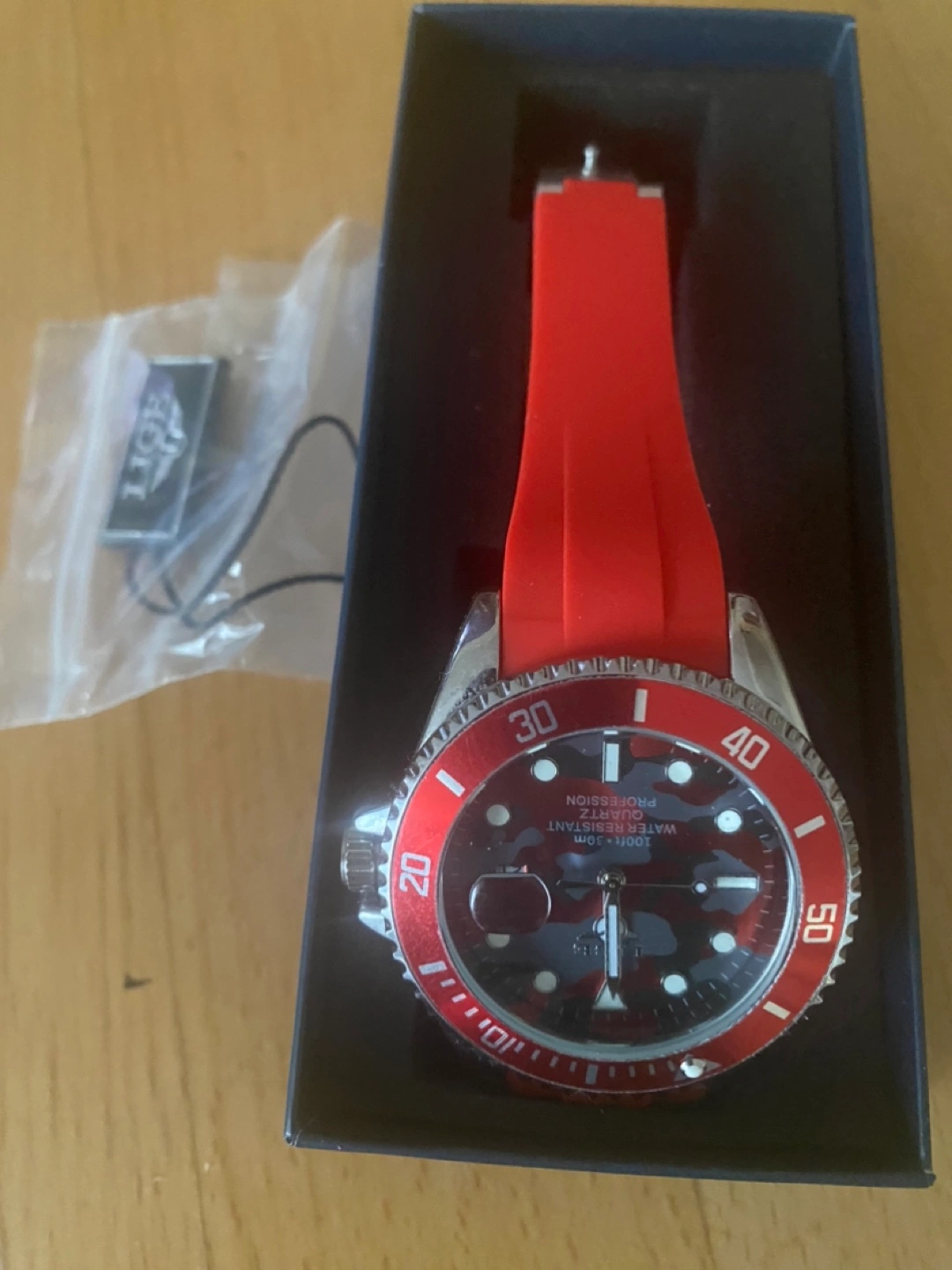 New men's watch. Red silicone band. Camouflage print face. Water resistant. Comes in original box.