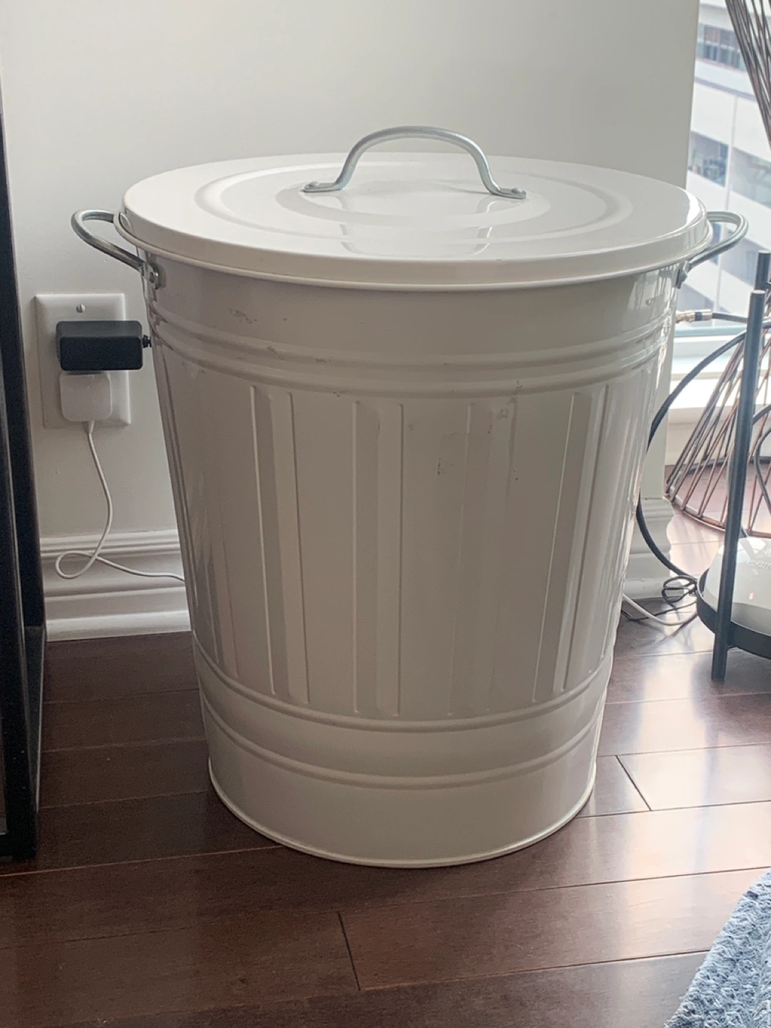 Large white metal trash can. Features a removable lid and side handles. Good condition. Was only used for storage. Selling because I no longer have space for it.