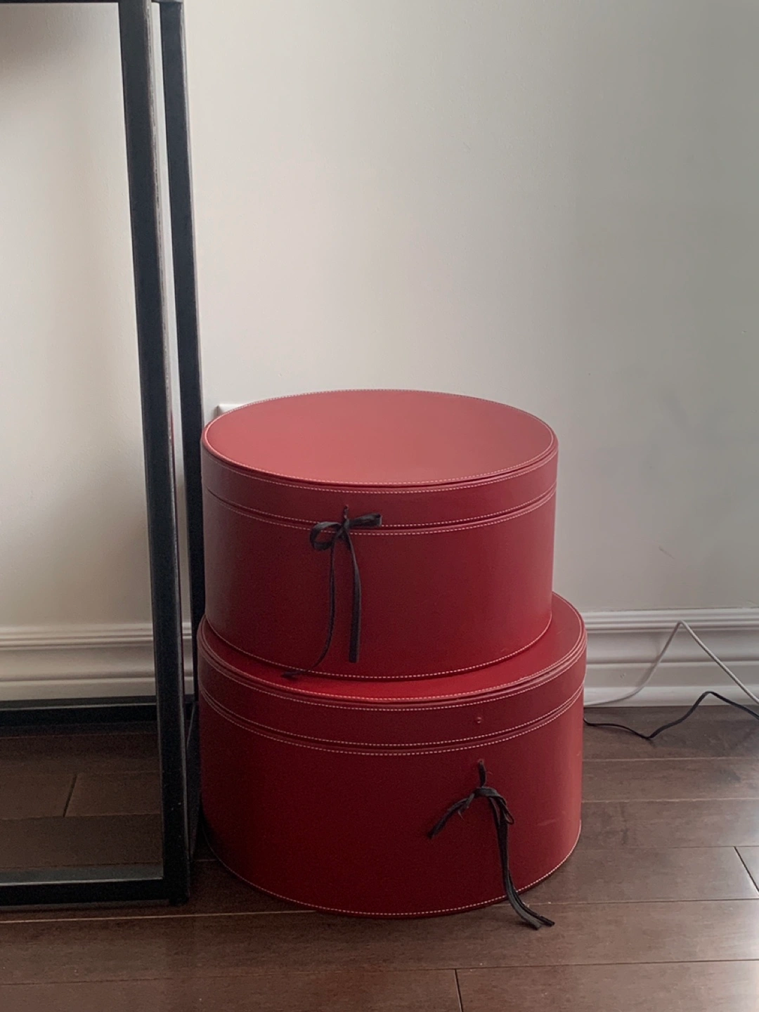 Two round stackable boxes. Cherry red leatherette material with ribbon accents. Perfect for organizing or storing your clutter.