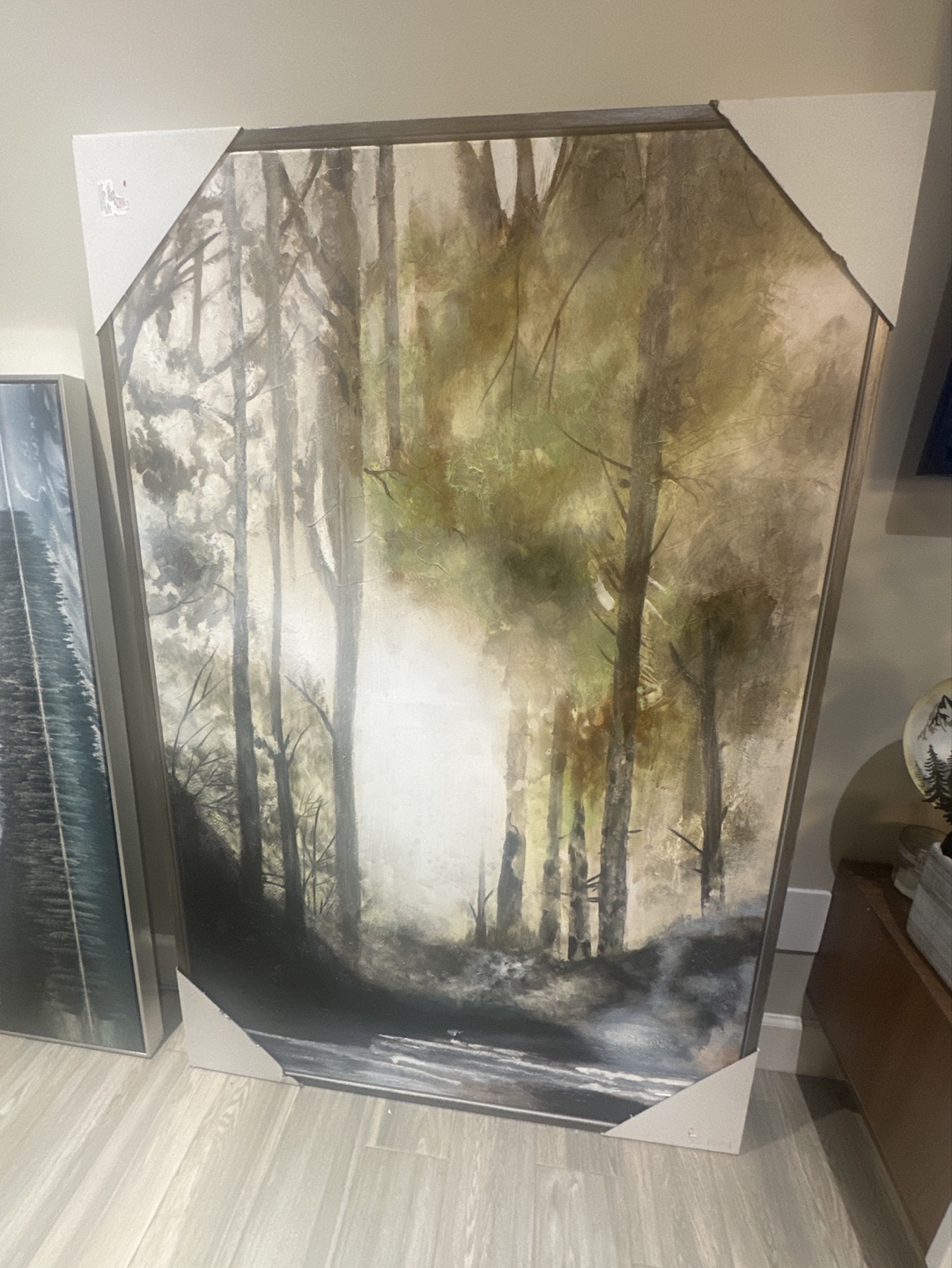 Large framed canvas print. Features a forest scene. Neutral colours. Looks great in a living room or bedroom. Brand New condition.