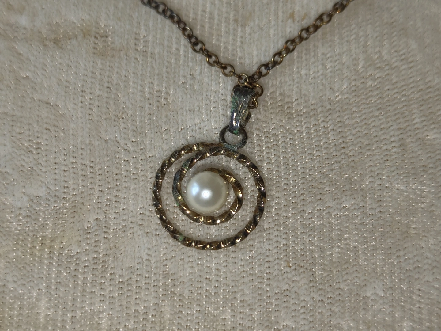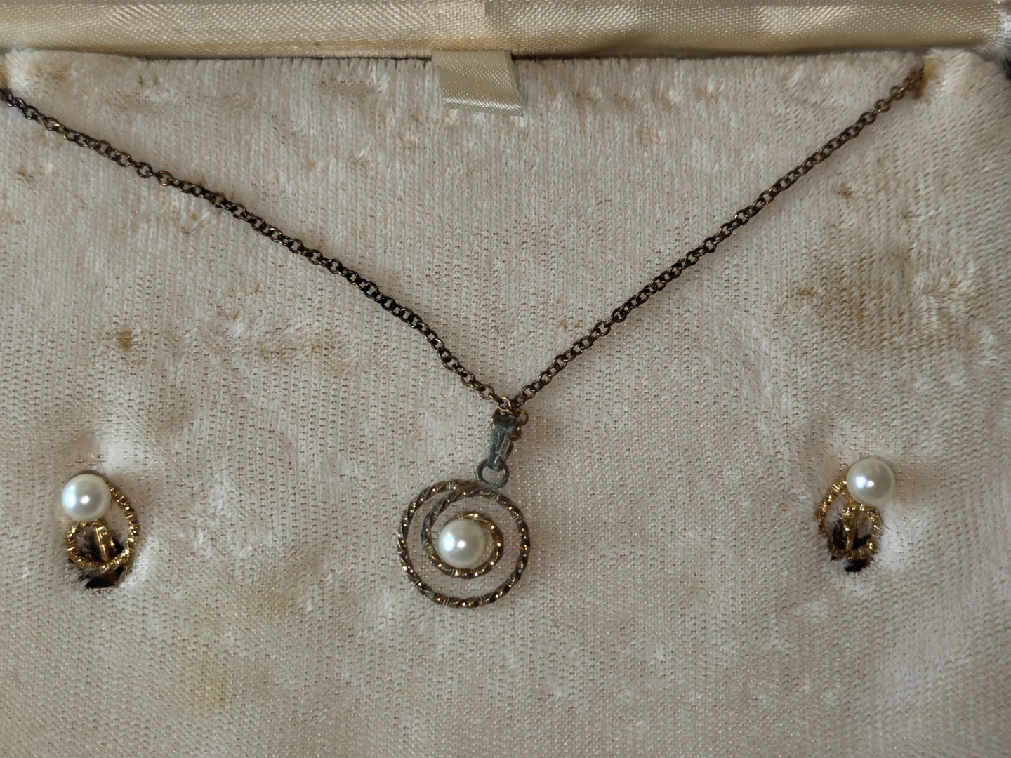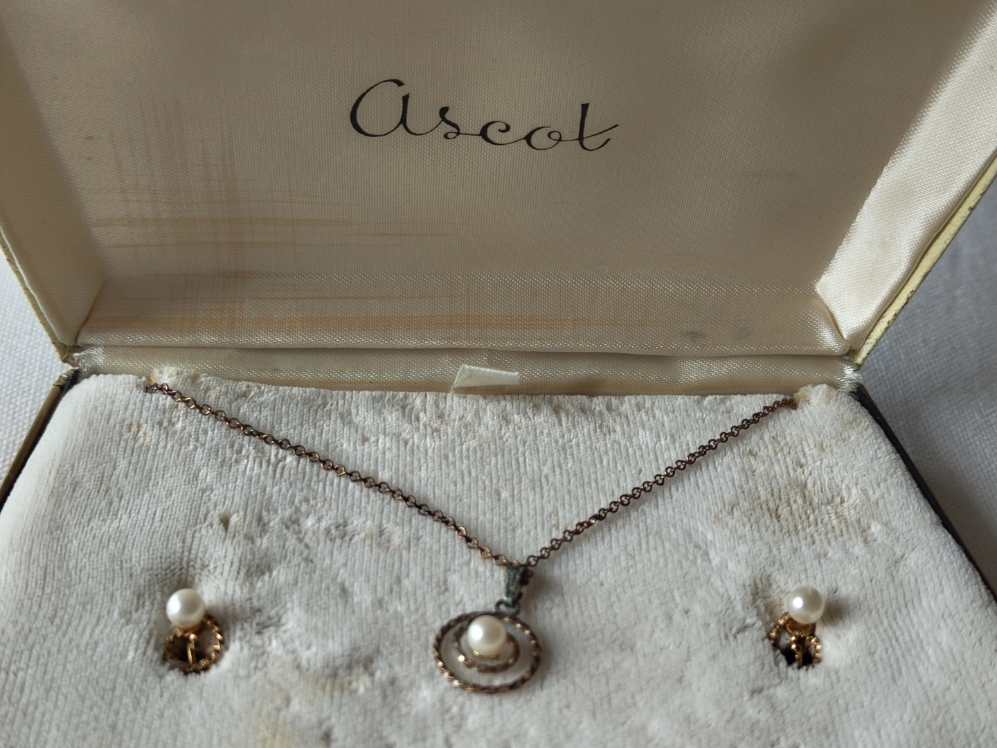 Vintage Ascot jewellery set. Includes a delicate necklace and matching earrings. Features small cultured pearls. Gold-plated chain and earrings, produced in the 1930s. Original patina intact.