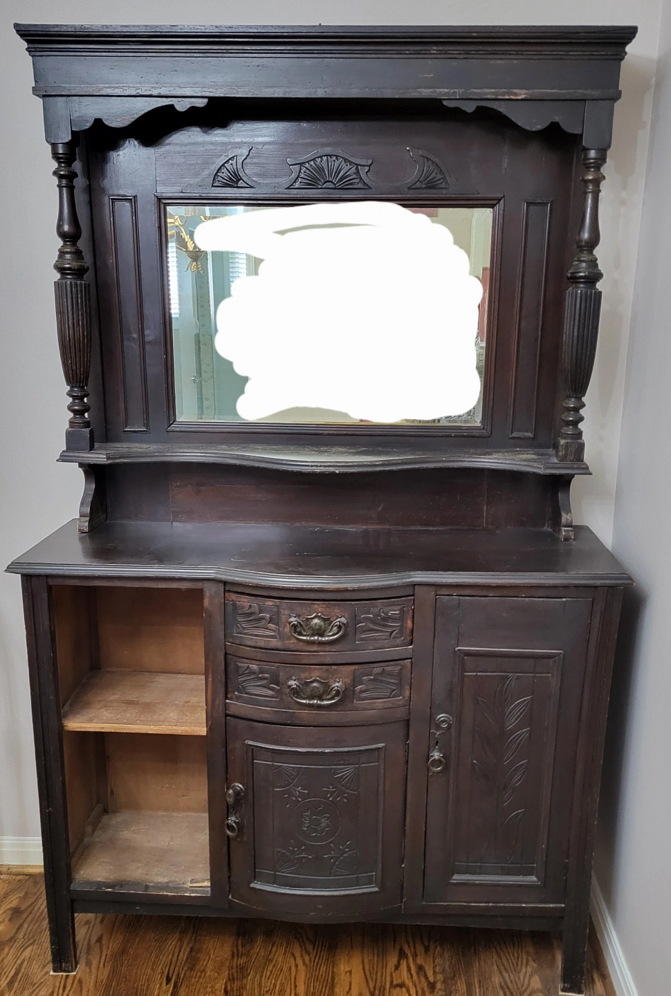 Solid wood and very ornate piece of furniture with mirror in the hutch. Missing a door. Measures: 73" high x 46" long x 15" deep.