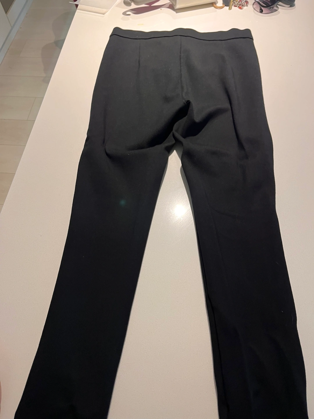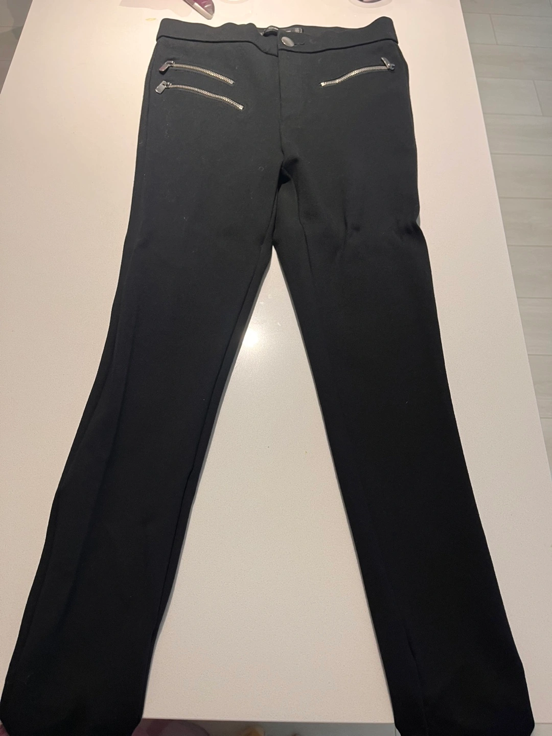 Black ankle-length pants. Features a pull-on waistband and zip detailing on the legs. Great for work or casual wear.