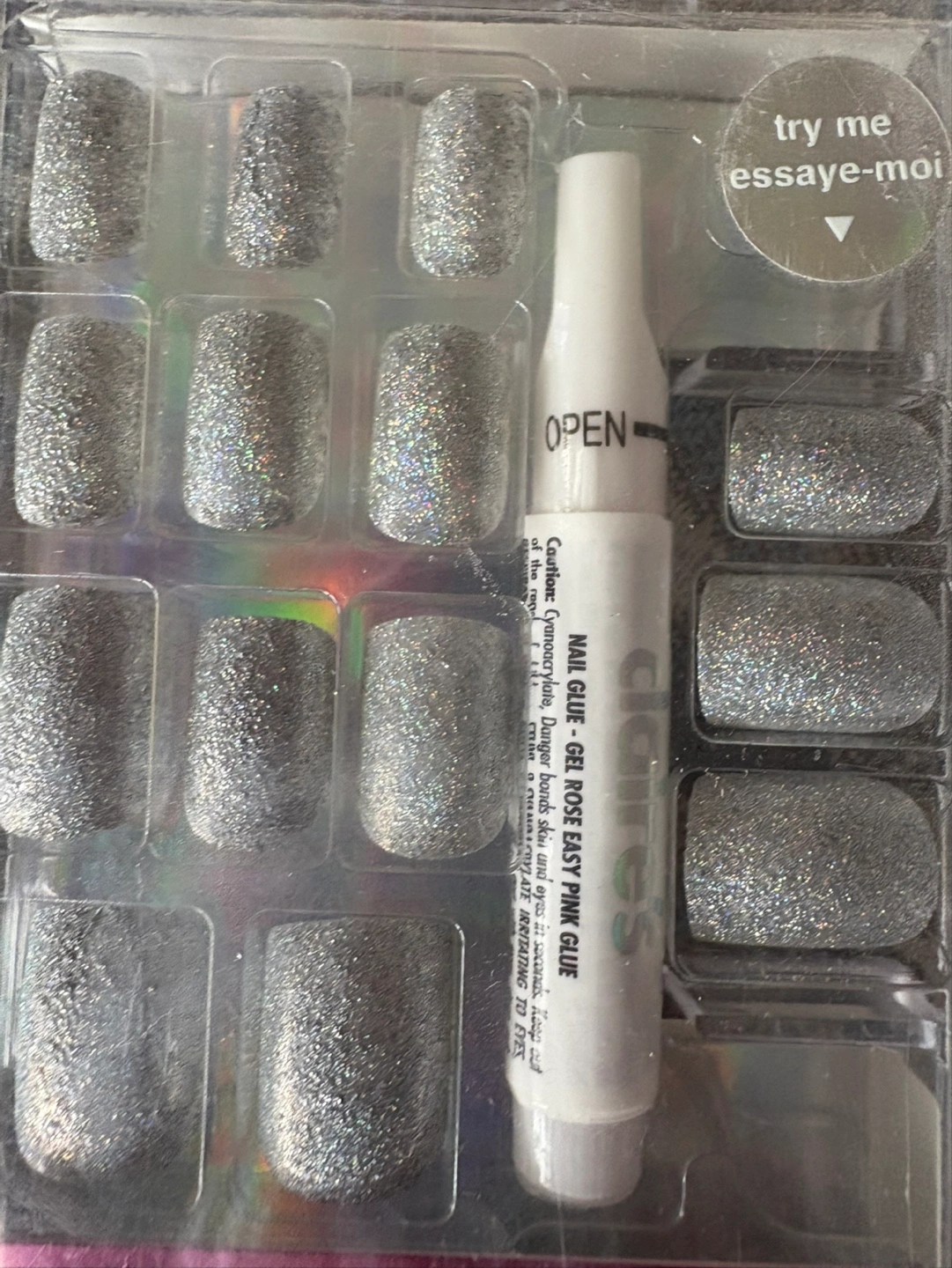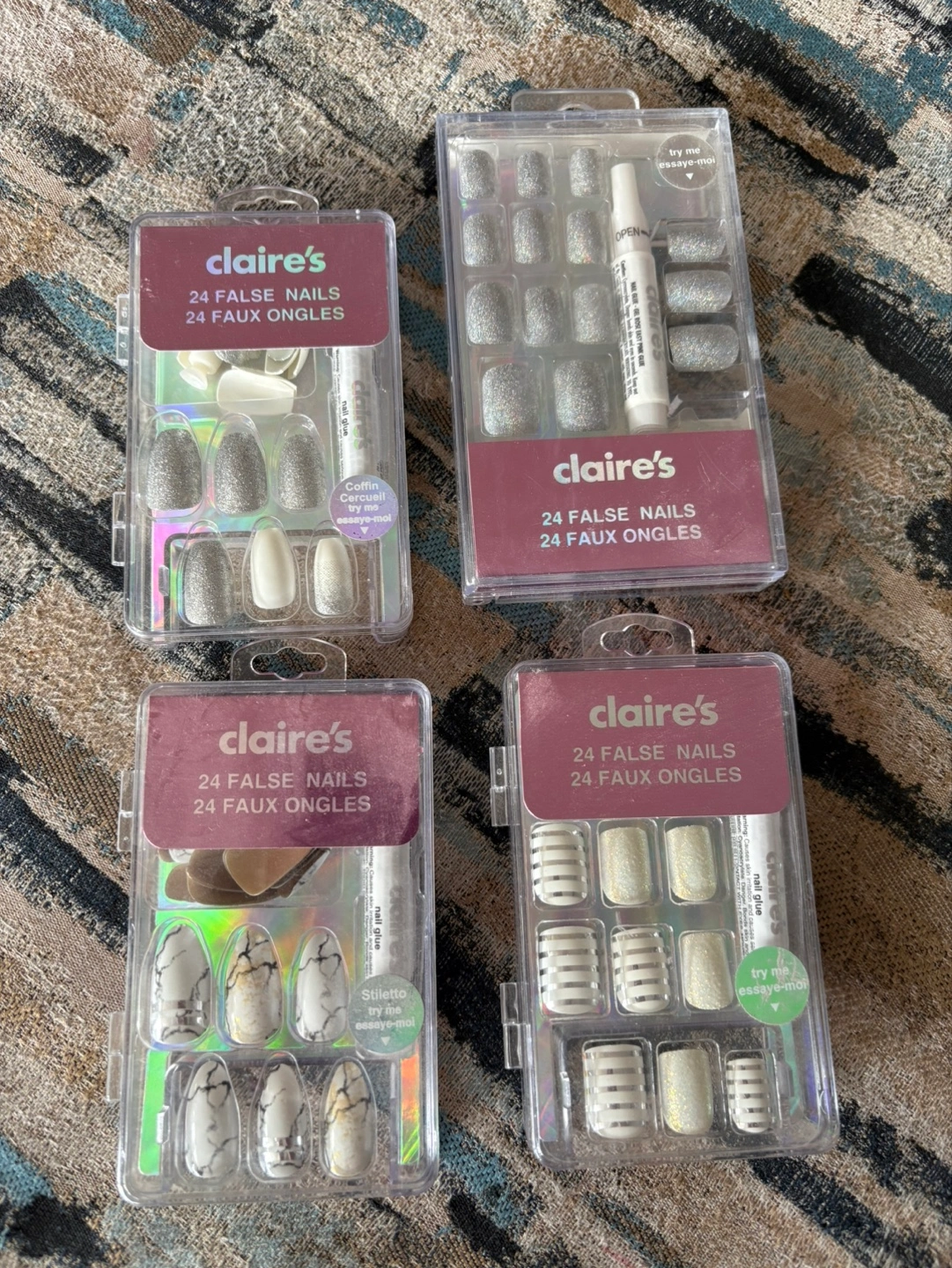 Four packs of Claire's 24 false nails. Nail glue included. Various styles: glitter, striped, stiletto, coffin. Price is for bundle