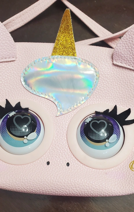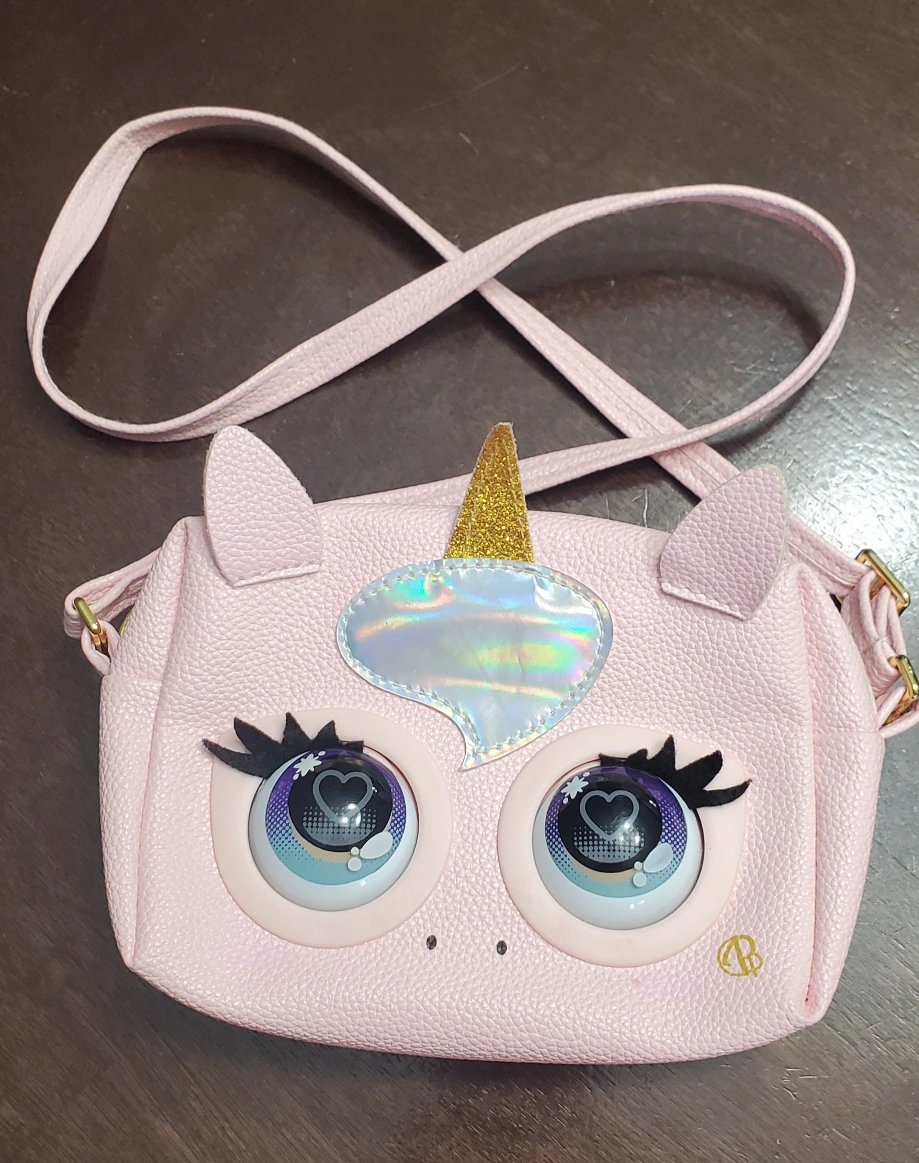Cute pink unicorn-shaped crossbody bag. Features large, expressive eyes and a gold horn. Includes a hidden zippered compartment. Perfect for kids or collectors. Delivery is available on little bit of gas money.