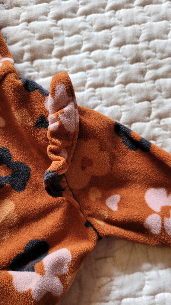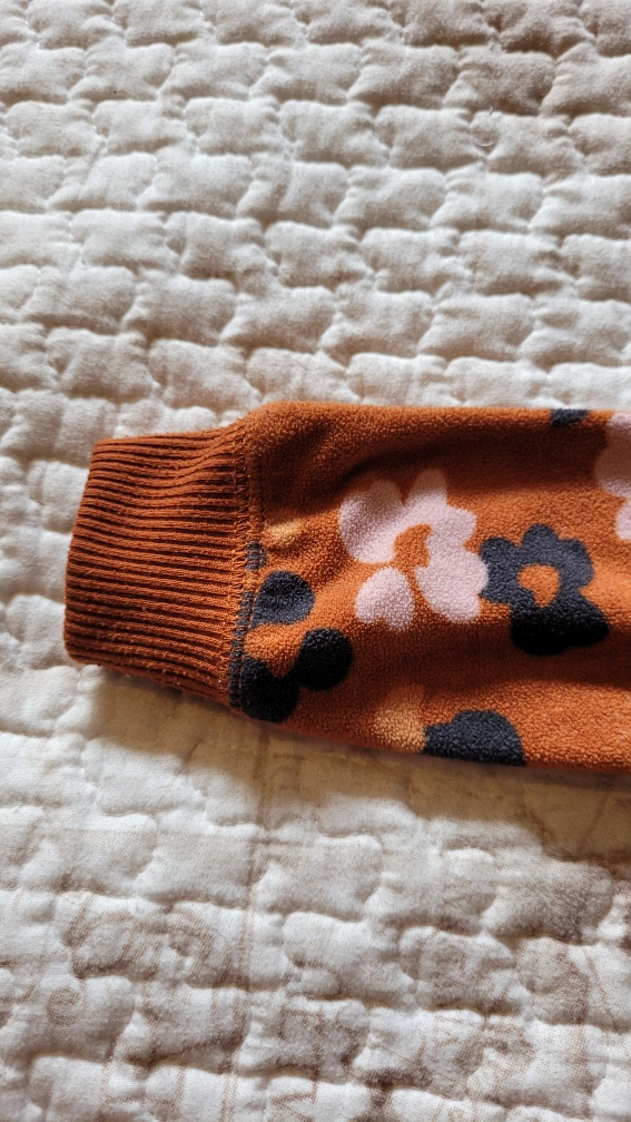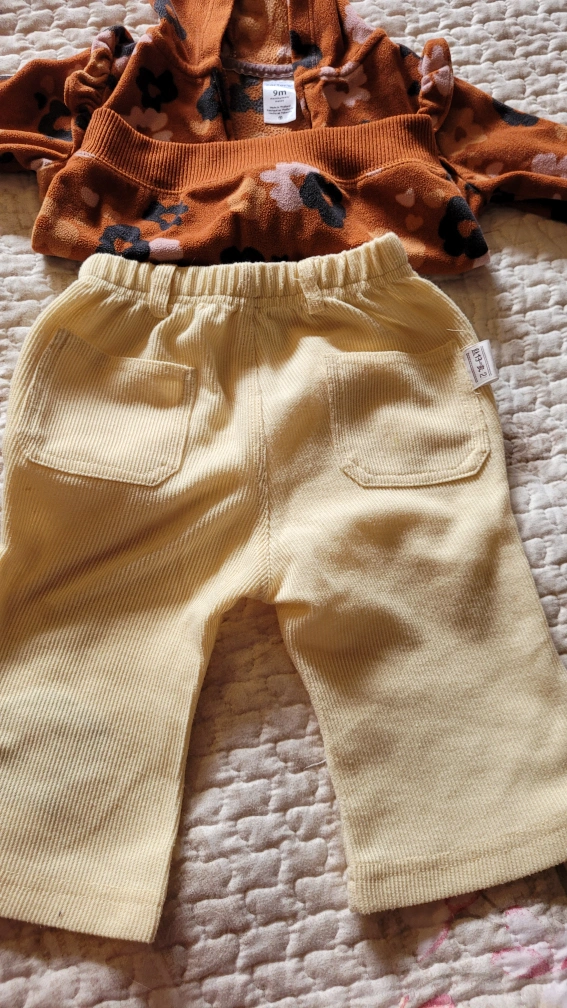 365Adorable Carter's outfit. 9-month-size. Features a rust-coloured floral zip-up fleece hoodie and a pair of pale yellow corduroy pants. Pants have Hello Kitty embroidery. Excellent condition. can meet at Seton, Cranston, Mackenzie Town as well.