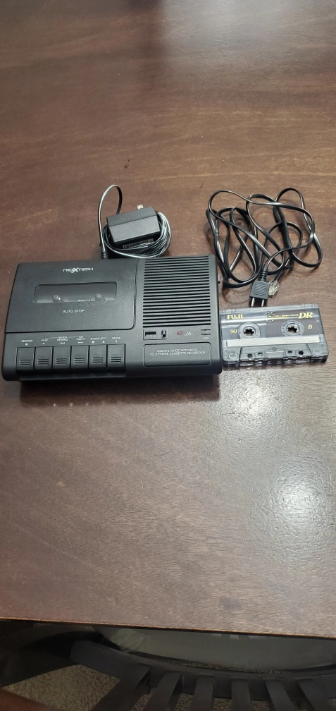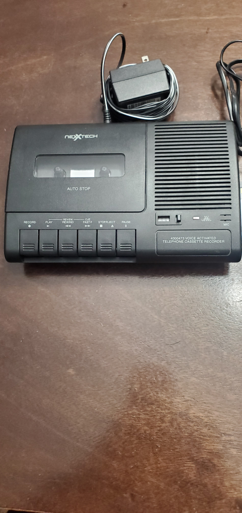 Vintage Nextech telephone cassette recorder. Includes power adapter and one Fuji cassette tape. Voice activated. Features include record, play, review, fast forward, stop/eject, and pause. used only twice. Delivery is available on little bit of gas money.