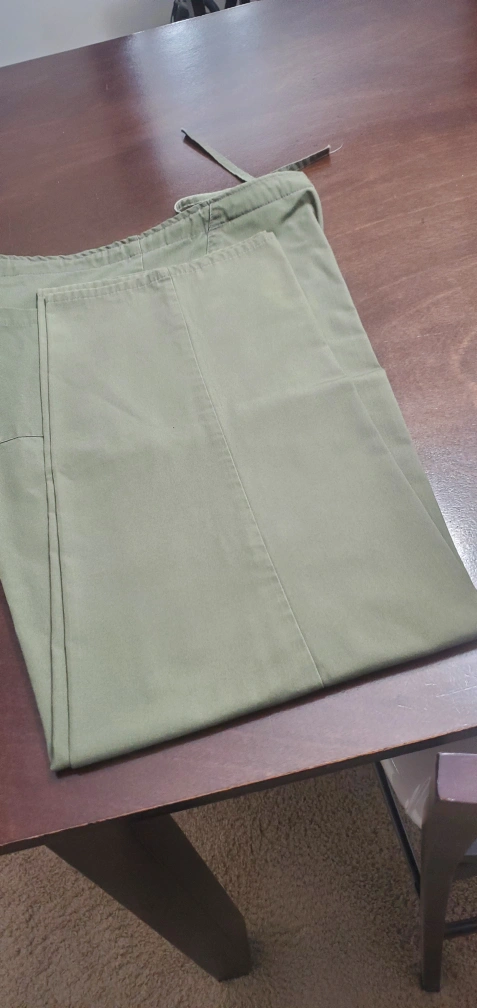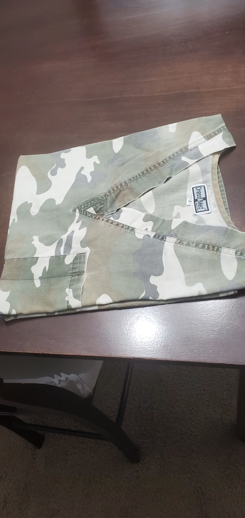 Pair of scrub pants and top. Green pants, drawstring waist. Camo top, V-neck. Both appear to be in good used condition. Delivery is available on little bit of gas money.