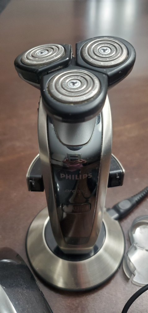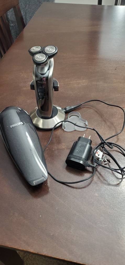 Cordless electric razor. Three rotating shaving heads. Includes charging stand, cleaning brush, and power adapter. Great for travel. Delivery is available on little bit of gas money.