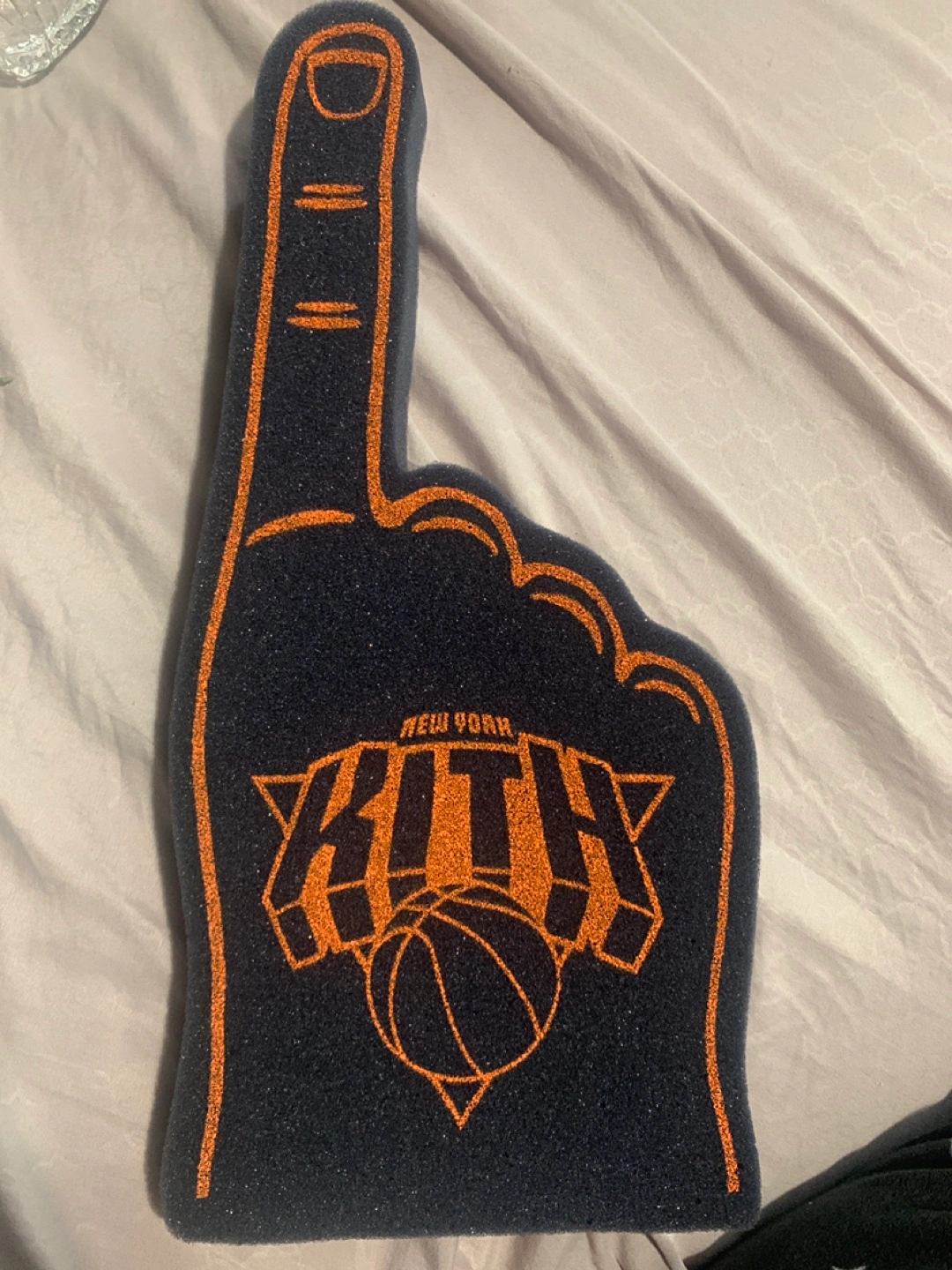 New York Knicks foam hand. Features Kith branding. Great for showing team spirit!