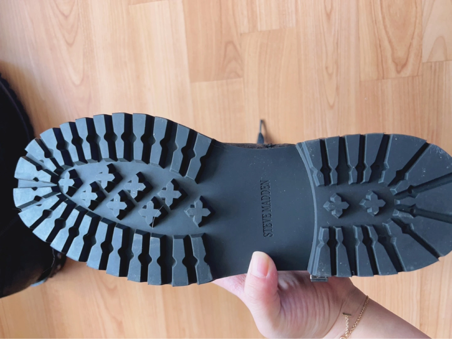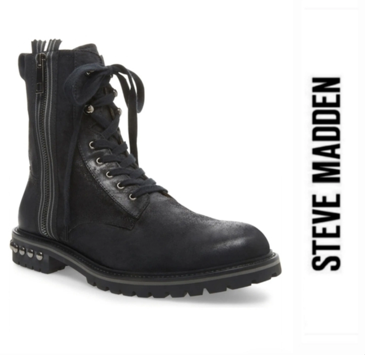 Black suede combat boots. Lace-up closure and side zipper. Studded detailing.