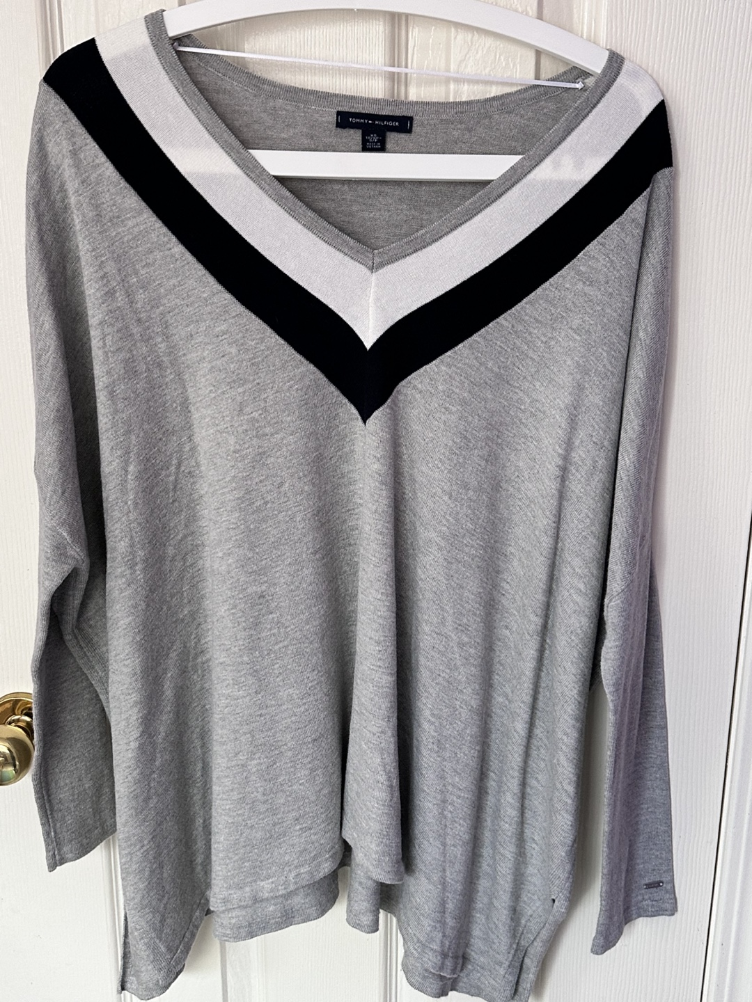Grey sweater, V-neck, long sleeve sleeves, colour block detail. Relaxed fit.
