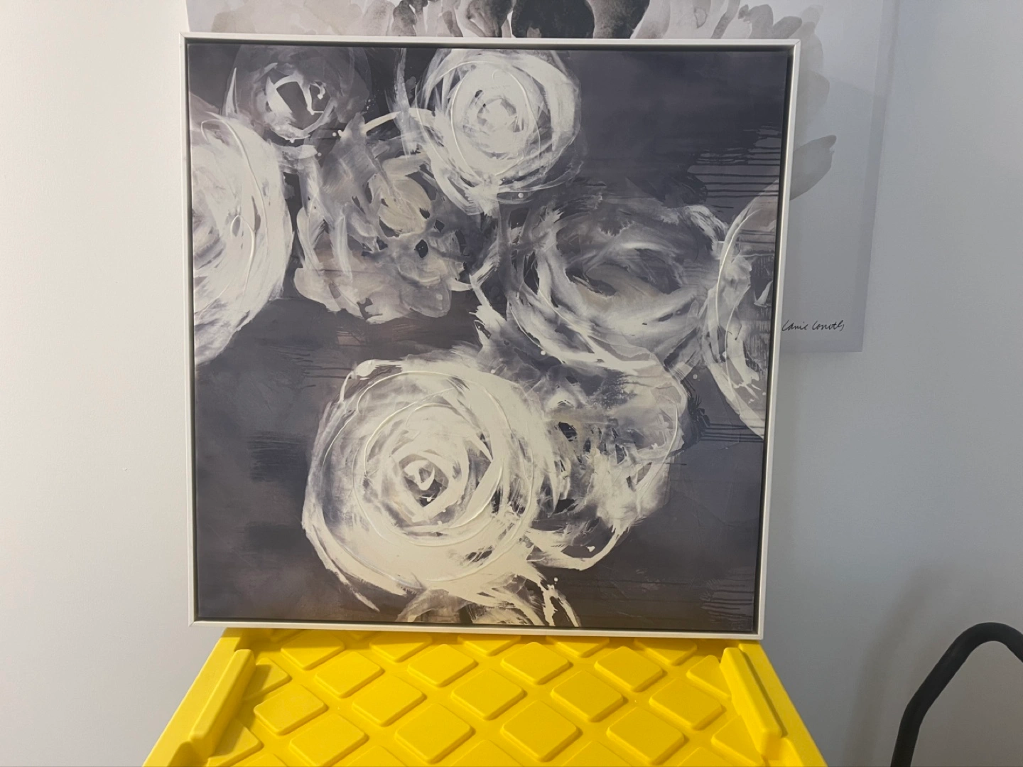 Beautiful framed canvas print. Features abstract floral design in grayscale. White roses on a dark grey background. Looks great in a modern home.