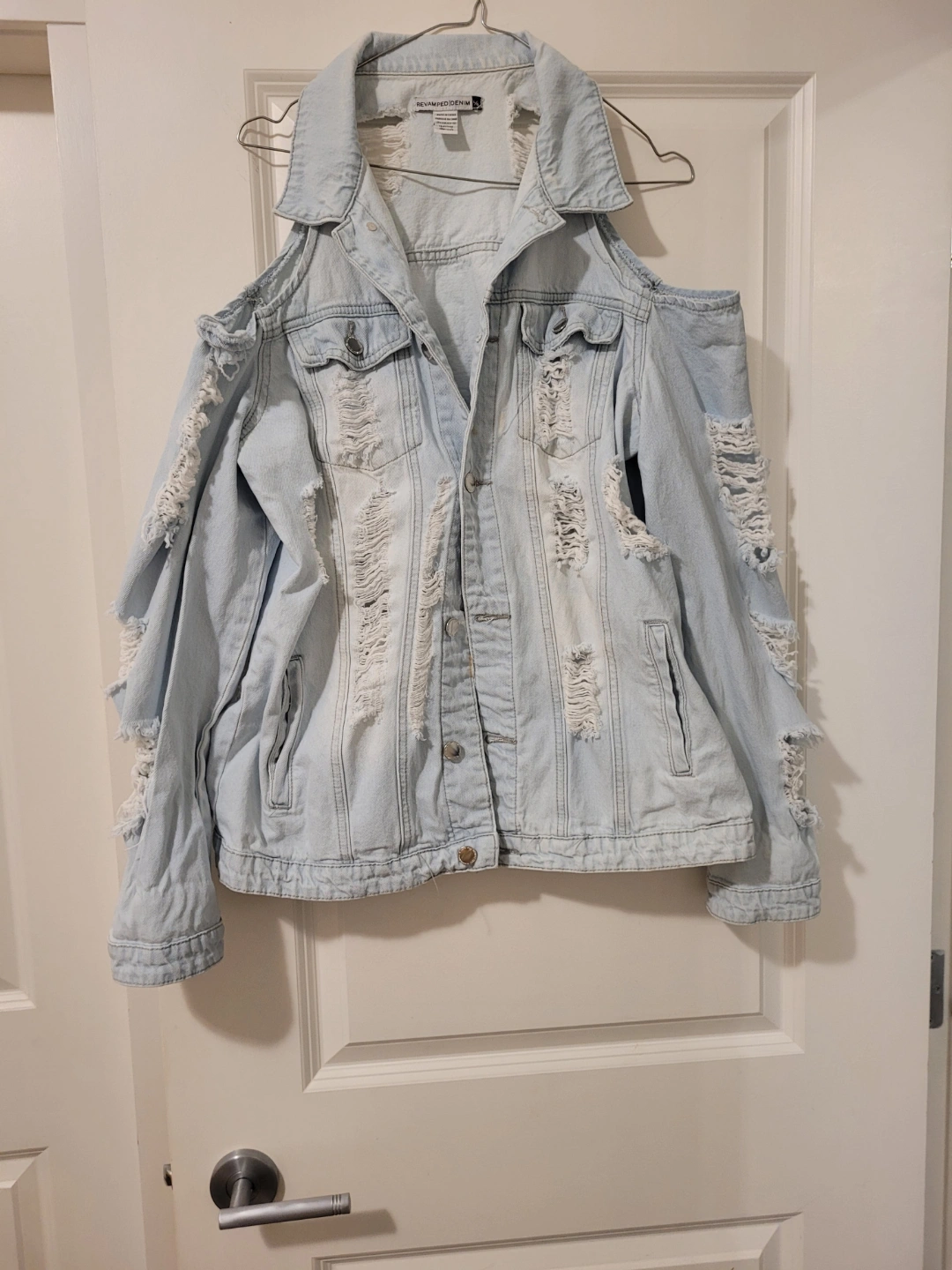 Light wash denim jacket. Cold shoulder detail. Distressed/ripped look throughout. Size large.