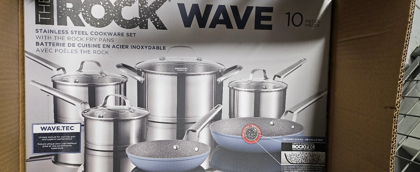 14510-piece stainless steel cookware set. Includes fry pans. Features Wave.Tec non-slip grip and Rock.Tec non-stick surface. brand new ! 120$ regular - 199$