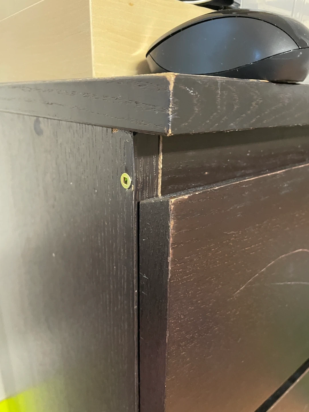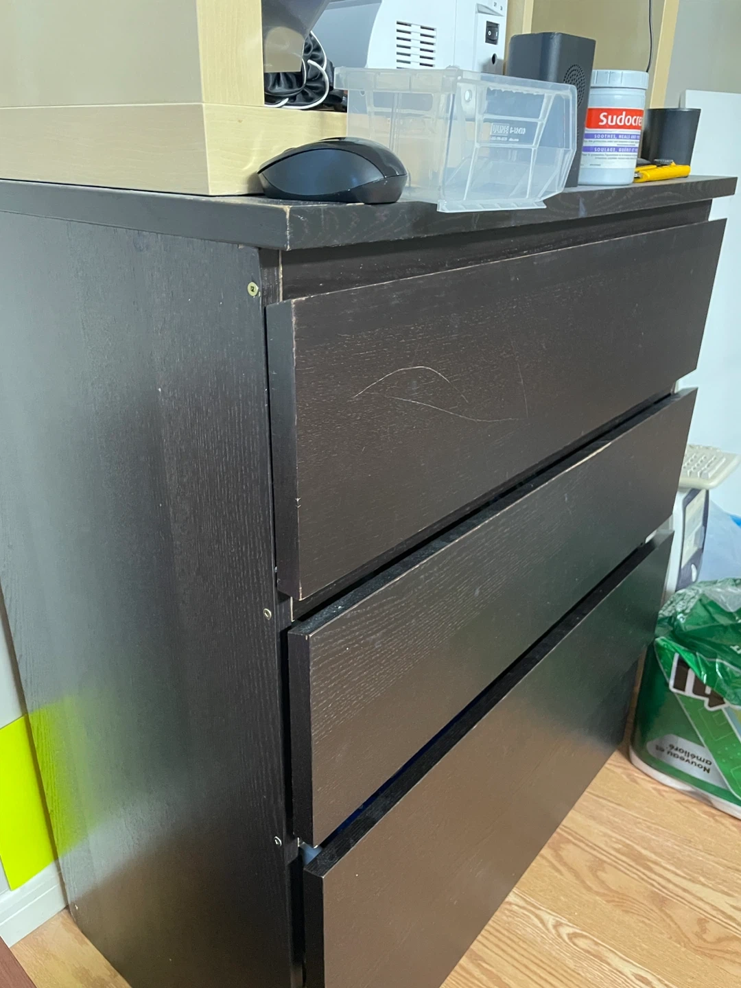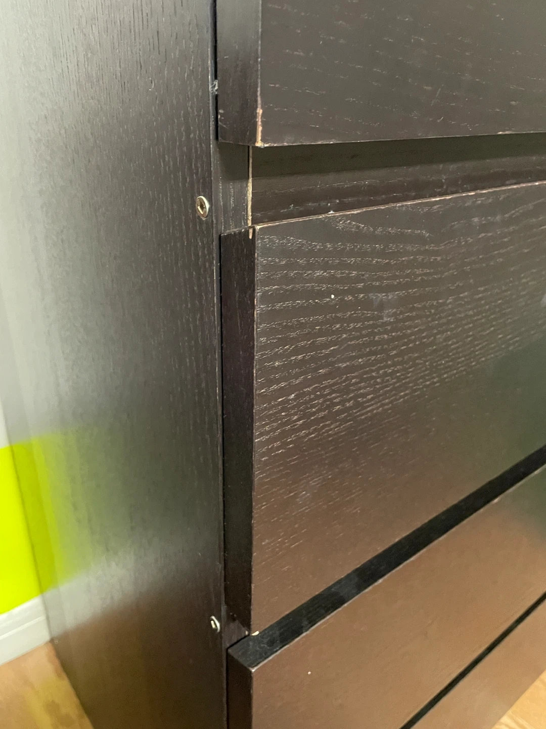 This is a dark brown, 4-drawer dresser. It's made of particleboard with a laminate finish. Some minor scuffs are visible on the top drawer fronts.
