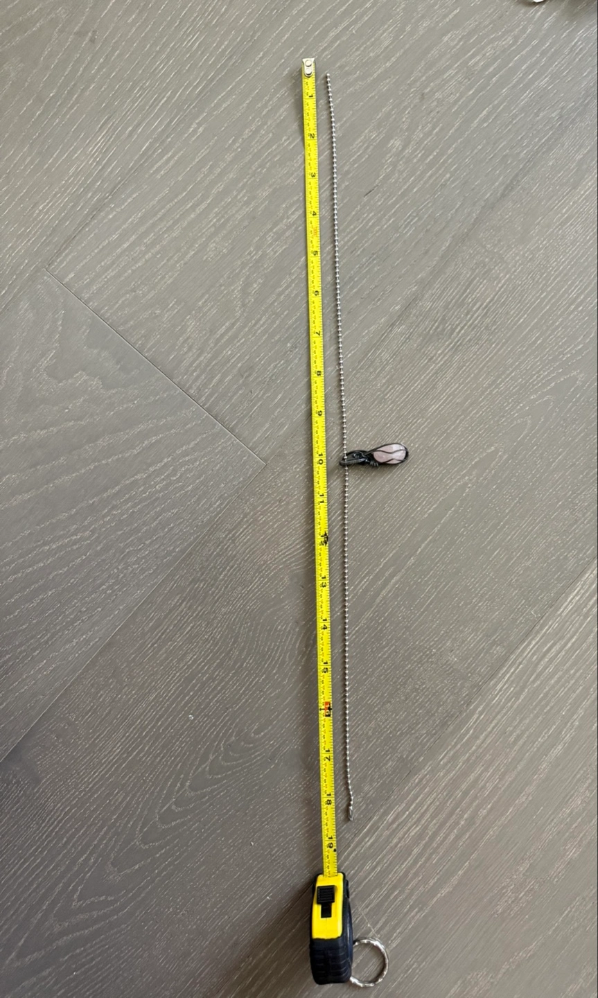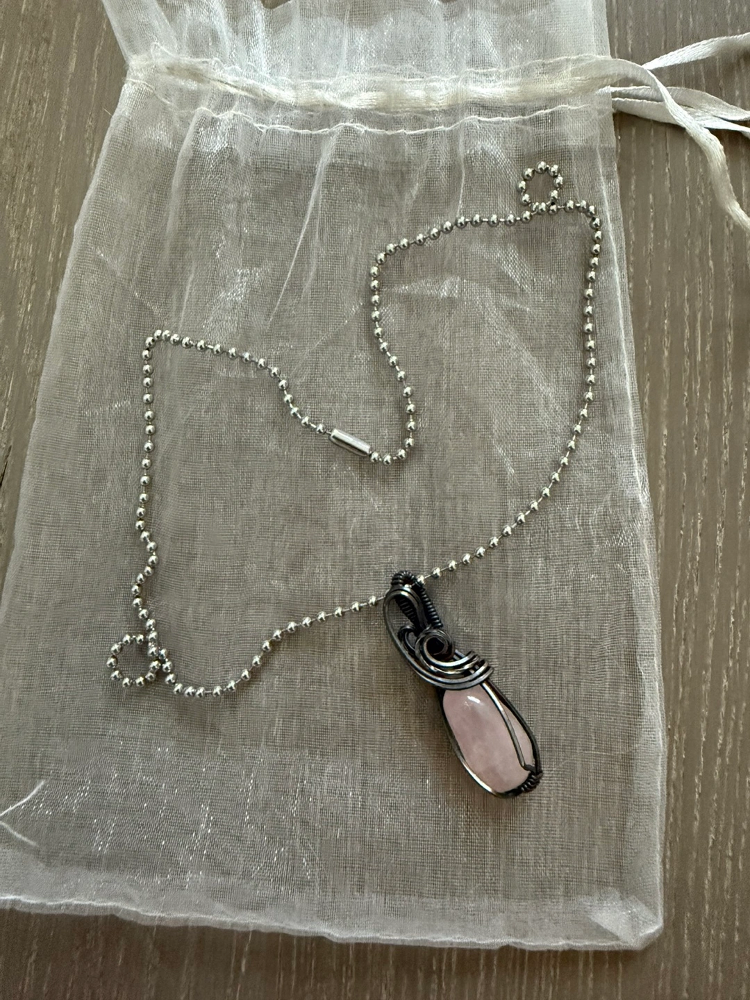 Delicate rose quartz pendant necklace. Features a silver wire-wrapped rose quartz stone. Pendant hangs from a stainless steel ball chain necklace. Approximately 20 inches long.