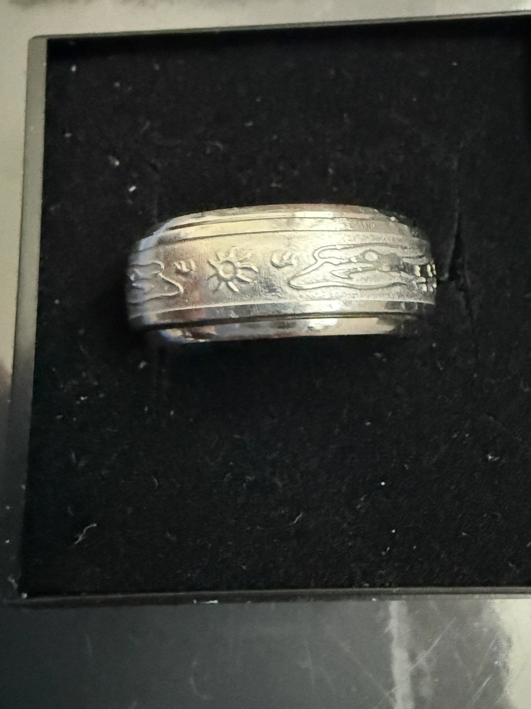 Silver metal spinning band ring. Features dragon and sun engraved designs, possibly nautical theme. Wide band.