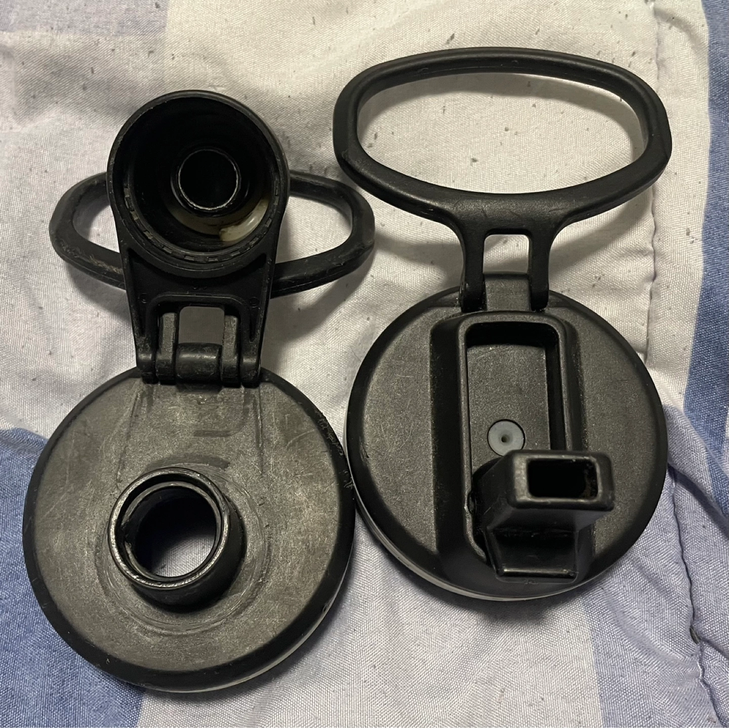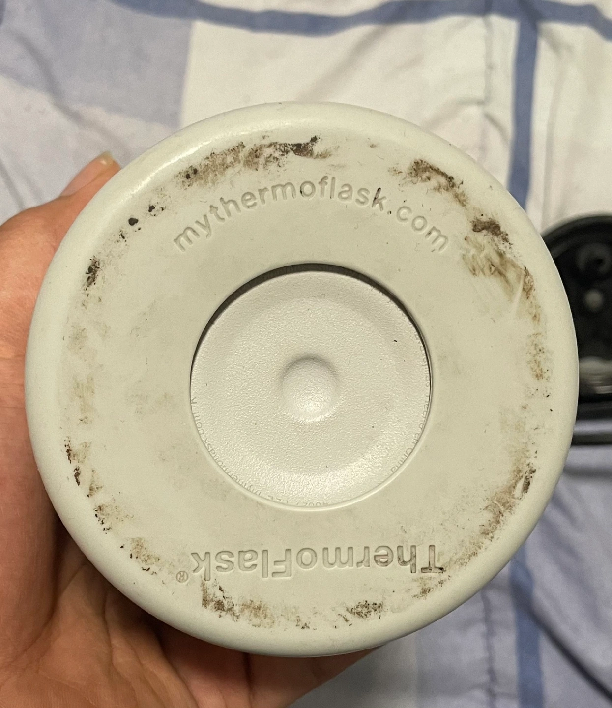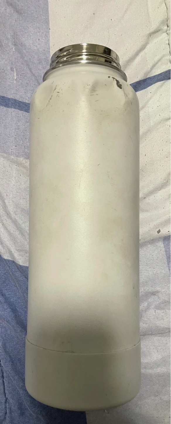 Pre-owned it’s dirty yes, Thermos Flask water bottle, Grey, two lids one twist and one flip straw(no straw). Has a handful of dents but doesn’t affect using the bottle, holds any liquid no leaks.