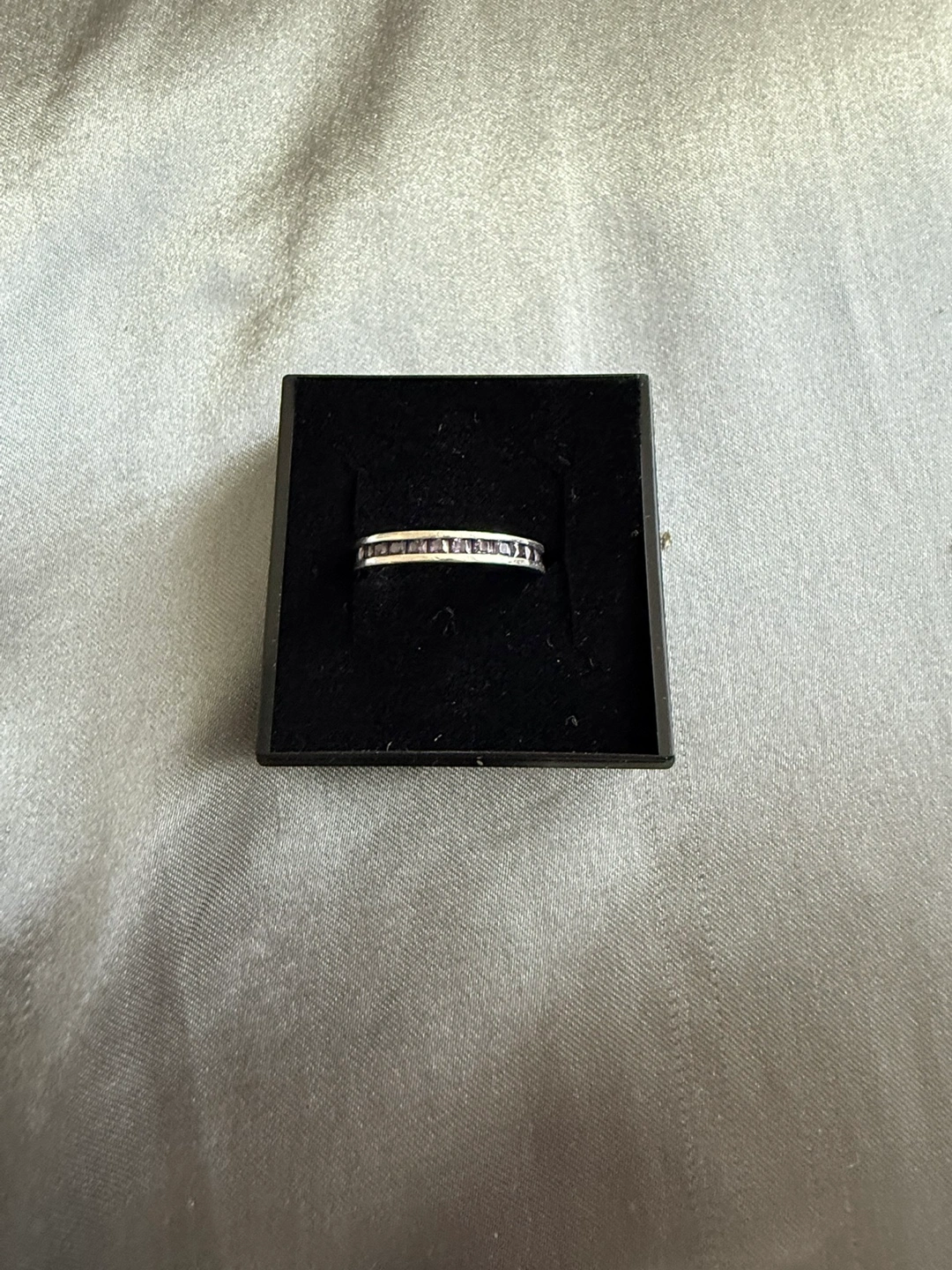 Beautiful eternity band featuring small amethysts or some purple crystal. 925 Sterling Silver band. Size 5 US approximately. Comes in a black ring box.