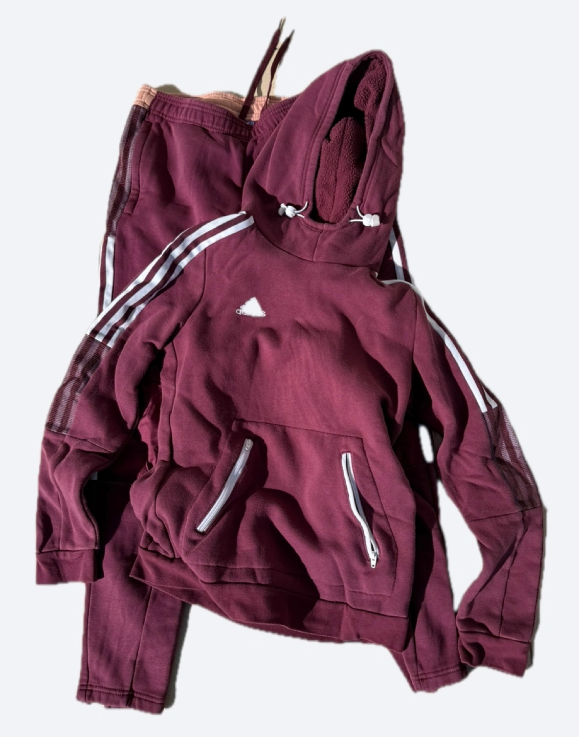 Women's Adidas tracksuit. Burgundy colour. Includes matching hoodie and sweatpants. Size small. Soft fleece interior.