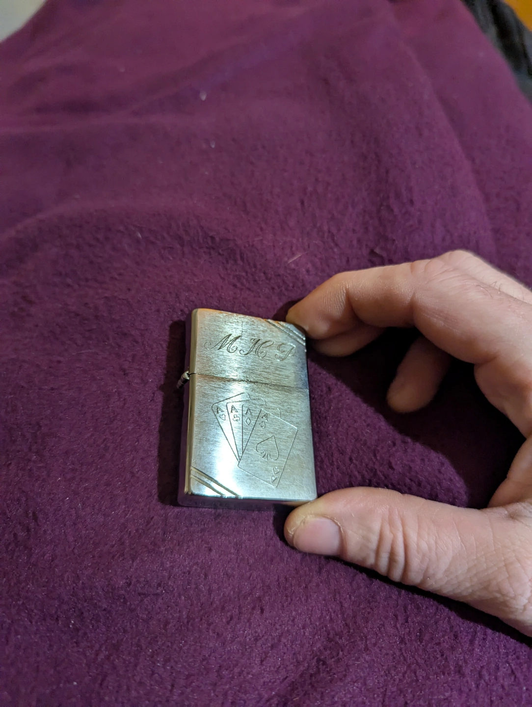 Collectible Zippo lighter. Engraved with playing cards. Silver finish. Made in the USA. D10 2010 works great, new flint four Aces design final price, open to trades or make me an offer